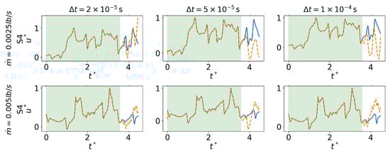 As shown in Figure 8, ES-DMD (S4) accurately reconstructs the oscillatory signal during the training window and maintains stable short-term prediction for a fraction of the subsequent period across all time steps. This prediction horizon is sufficient for boundary-condition applications in coupled simulations, where the ROM is evaluated repeatedly over short macro-time steps.