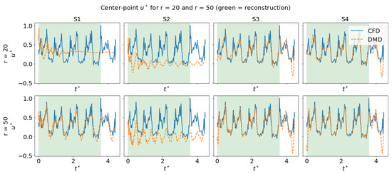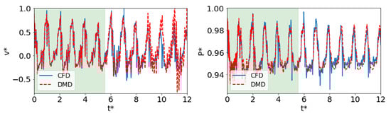 Figure 12 demonstrates that ES-DMD (S4) combined with time-delay embedding enables accurate multi-period prediction of both velocity and pressure using a minimal number of modes. The model reproduces the dominant oscillation peaks and phase during reconstruction and maintains stable oscillatory behavior into the prediction window, supporting its intended use as a time-resolved boundary-condition generator. Compared to the 150 modes required for comparable two-dimensional field reconstruction, this represents a substantial reduction in model complexity.