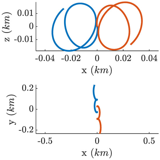 As an initial validation of the collision-avoidance (CA) maneuver, a simplified scenario involving only two satellites is considered. The initial conditions are selected such that the follower satellite detects a neighboring agent at an unsafe distance and consequently activates the CA control law, while the alignment and attraction behaviors are temporarily disabled. As shown in Figure 5, the along-track separation between the two spacecraft is successfully increased to a safe value. The apparent motion of both satellites is a consequence of expressing the relative trajectories in a reference frame centered at the swarm center of mass, which is adopted here and throughout the remainder of the paper.