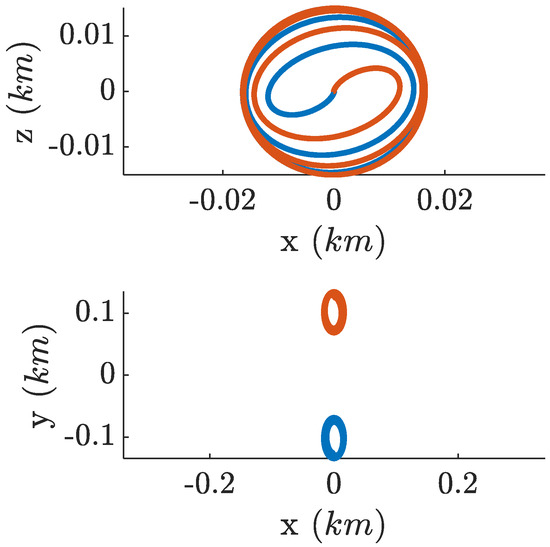 It has been shown in [25] that parallel differential eccentricity and inclination vectors offer maximum safety with respect to collision avoidance; in fact, a failure of one satellite with consequent along-track drift would not lead to a collision, as shown in Figure 4.