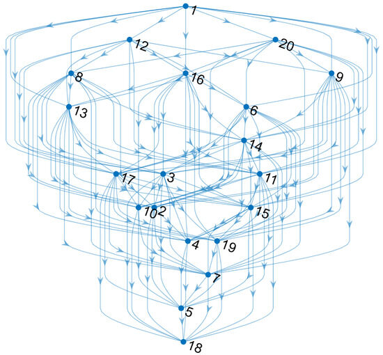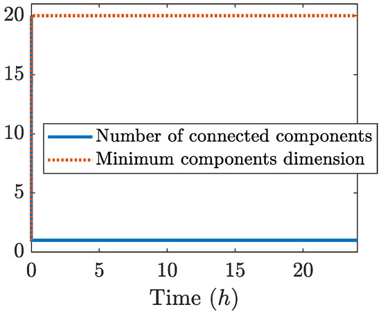 The simulation time is set to 24 h, and it has been repeated for many different random initial configurations, obtaining (qualitative) similar results: only one sample simulation is reported here for brevity and clarity of the plots. As it is possible to see from Figure 10, during all simulations, there is only one connected component, of course, of dimension equal to 20 (i.e., the swarm is always connected). The digraph at the final time is represented in Figure 11, where it is possible to see that no agent is isolated; the only satellite that does not detect other agents is No. 18, which is the spacecraft that precedes all others.