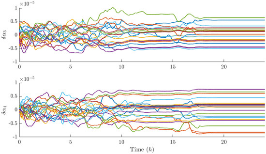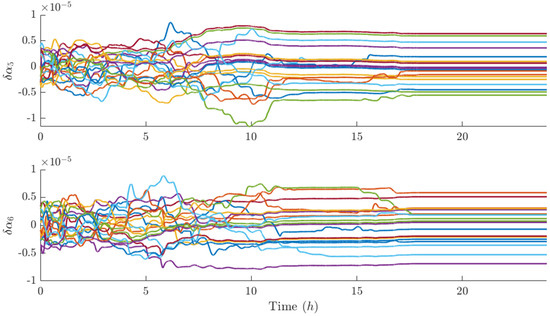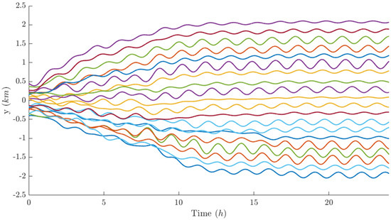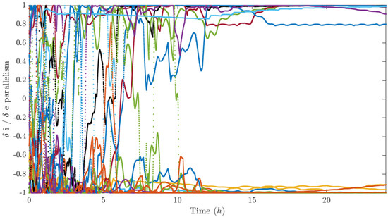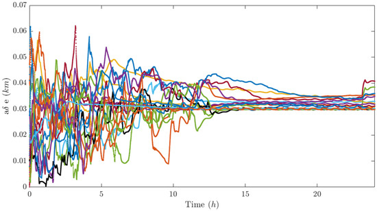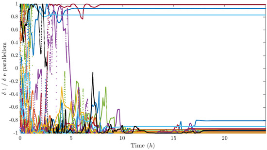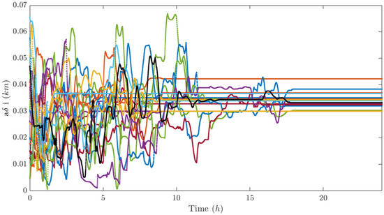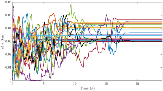 Figure 12, Figure 13 and Figure 14 report the components of the differential element vector δ α k of each satellite with respect to the center of mass of the swarm. It can be seen that the differential semimajor axis is set to zero in less than 20 h (Figure 12 upper subplot) and the longitudinal separation of the swarm is fairly regular (Figure 12 lower subplot). Also, the differential eccentricity and inclination reach a stationary value, which, however, is difficult to interpret if we do not analyze the performance indices of each j-th satellite with respect to each k-th satellite in visibility. In this sense, the longitudinal distance of each satellite with respect to the closest visible agents is plotted in Figure 15, and it is greater than the minimum fixed value d m i n at stationary, the out-of-plane and radial dimensions of the relative ellipse (Figure 16 and Figure 17, respectively) are greater than the minimum transverse distance d m i n t r a n s at stationary, and finally, the parallelism between relative inclination and relative eccentricity vector is greater (in module) than 0.8 at stationary (Figure 18).