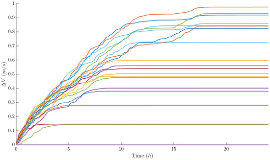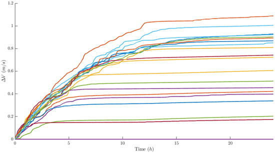 Running the same simulation of Section 4.2 while taking this rough estimation of relative state X into account and analyzing the performance indices, it is possible to see that they are not greatly degraded: the integrity of the swarm is always achieved, the distance (Figure 25) among the satellite in visibility confirms that no collision happens, and the minimum along-track distance of 100 m is always respected. Concerning the transverse behavior, Figure 26 and Figure 27 are encouraging, being always greater than the minimum of 30 m, and the parallelism is respected in all cases, as shown in Figure 28. The control cost, represented by the required Δ V , is not qualitatively different: in fact, a total value of 12.84 m/s for the 20 members is required, while 11.42 m/s is requested in the ideal case of perfect knowledge. The real and important difference is that in the ideal case, the control of the swarm reaches a stationary condition in which no further actions are needed (flat Δ V behavior in Figure 20), while using images, there is a slight increase in the Δ V also required in the last phases of the simulation (Figure 29).