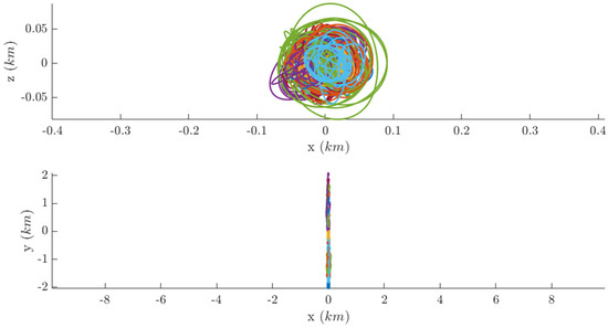 Figure 22. Cross-track (upper subplot) and in-orbit (lower subplot) projections of the relative trajectories with respect to the swarm center of mass.
