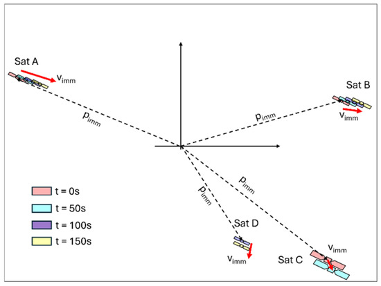 The values selected for the threshold distances have a large impact on the swarm behavior. The d m a x value has been selected taking into account the optical sensor characteristics, in particular the focal length and resolution of the camera, that make a swarm agent at that distance barely visible (area in the image plane of the order of a few pixels, see Section 5). The minimum along-track distance d m i n should ensure that satellites are not too close to each other in the velocity direction, but at the same time cannot be similar to or exceed the d m a x value; 1/5 of that value has been selected to allow a reasonable comfort range where the neighbor satellite can leave. Finally, d m i n t r a n s is connected both to the d m i n and to the sensors FOV: the selected value results from a trade between large d m i n values (they would increase safety, but the safe areas for neighbors risk being all outside the FOV) and small d m i n values (that would decrease the safety margins).