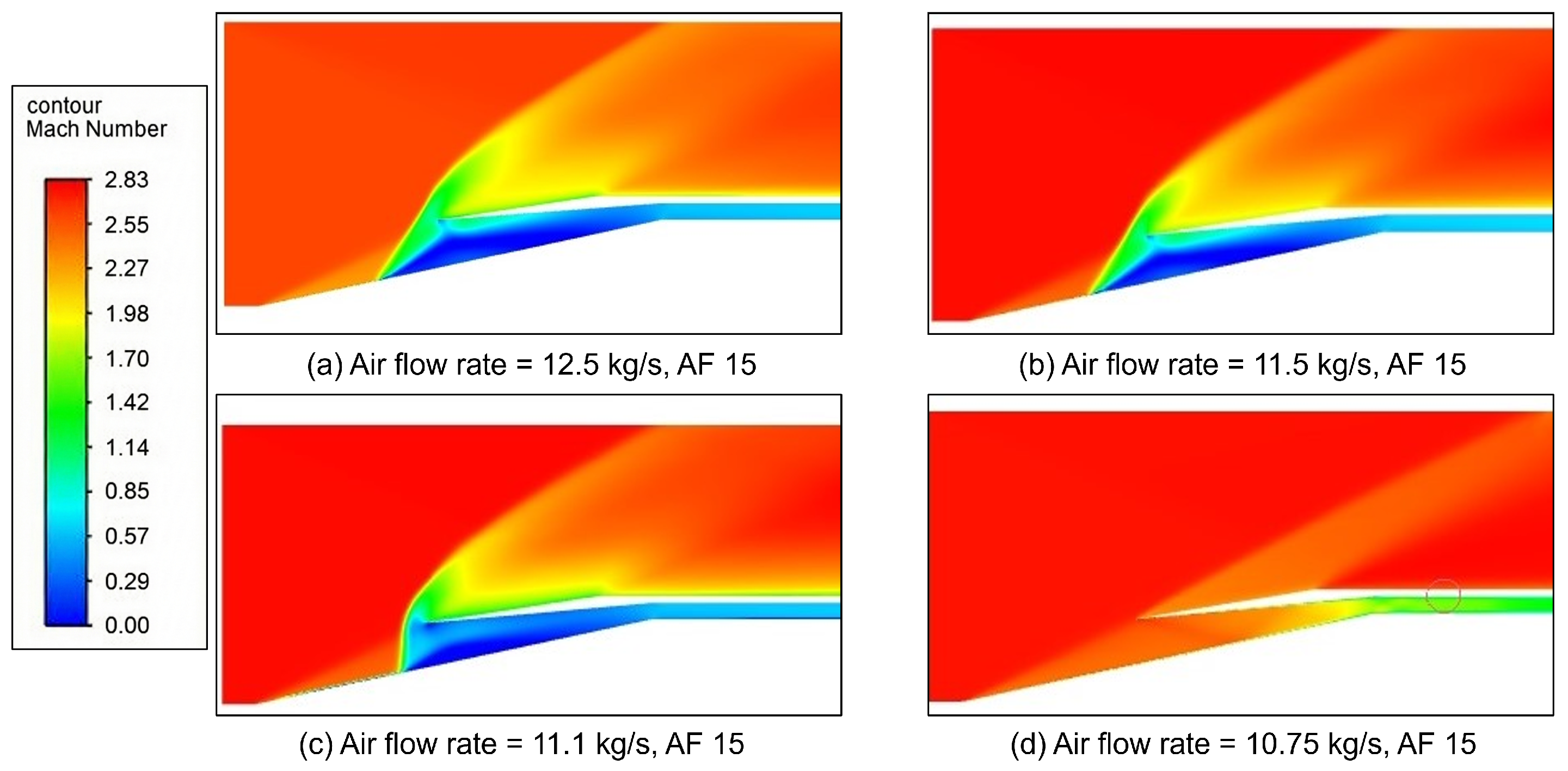 12] discussed the effect of combustion on the supersonic inlet system. The effect of heat addition at different modes of operation was analyzed by full engine simulation. Results showed that the terminal shock moves upstream upon heat addition in the combustor. The location of the shock and the shock reflections are affected not only by the geometries of the intake but also by the amount of heat released in the combustor. Comparing air–fuel ratios of 15–20, the lower air–fuel ratio could achieve a higher peak temperature because of the poor combustion at a high air–fuel ratio.