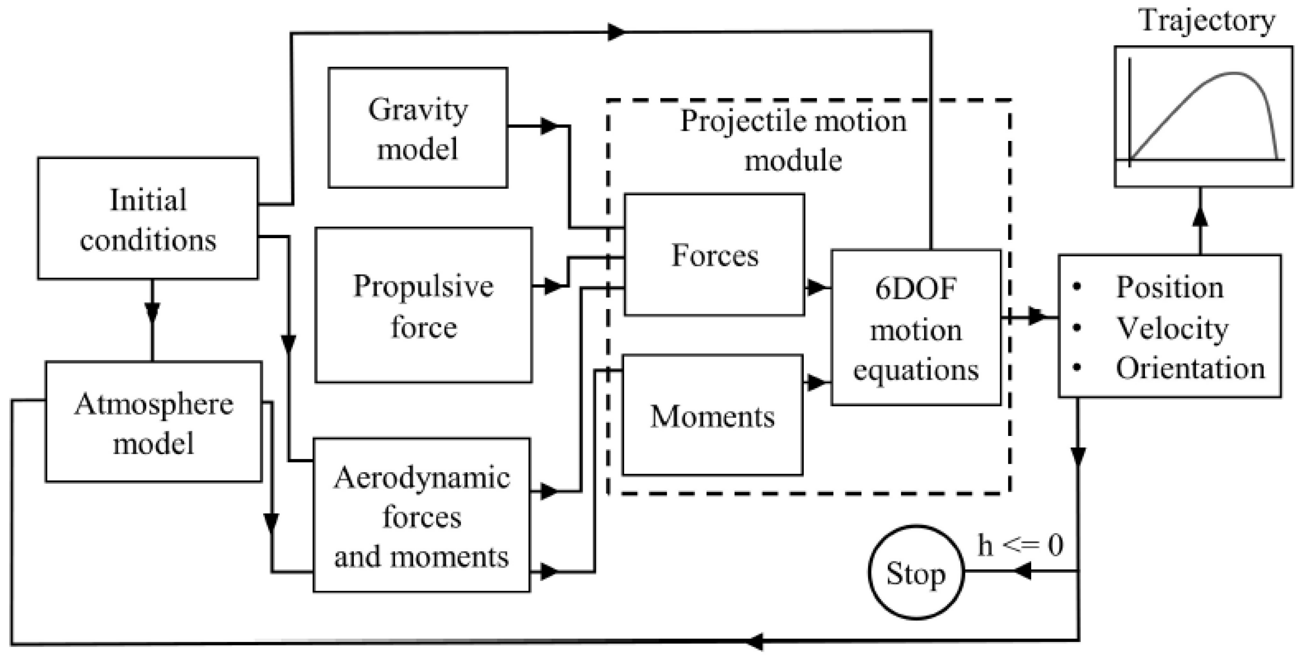 were also incorporated into the algorithm based on the computations. The variable step, ODE 45 (Dormand-Prince) solver, was used in the Simulink configuration, which uses the six-stage, fifth-order, Runge–Kutta method. The maximum time step was set to be 0.2 s. The simulation stops when the altitude of the shell reaches less than or equal to zero and provides the trajectory of the shell as the output.