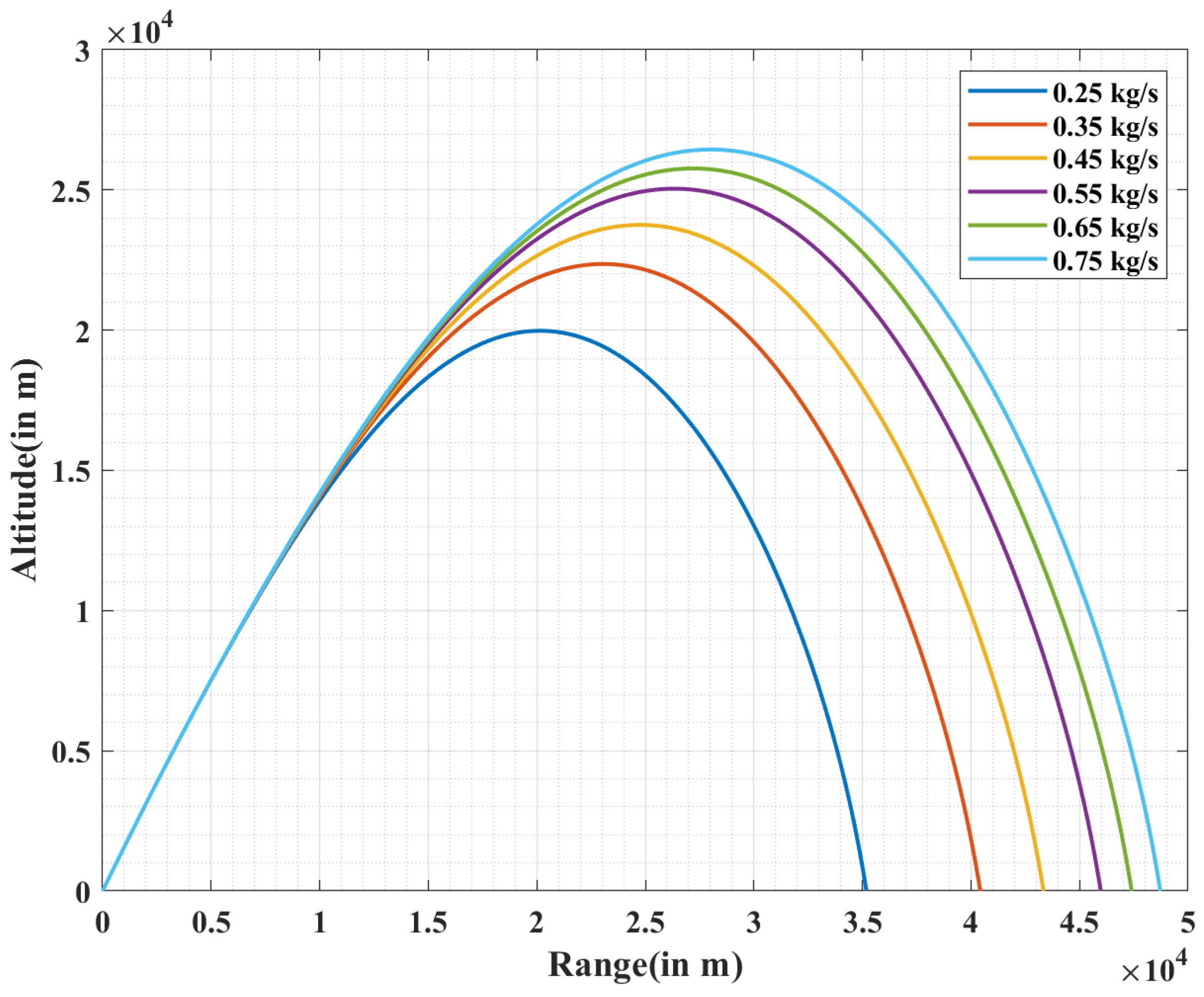 Figure 24, the shell achieves a maximum range of 48.7 km at an initial propellant flow rate of 0.75 kg/s, propellant weight of 2.6 kg and burn time of 13.4 s. Due to varying air–fuel ratio and