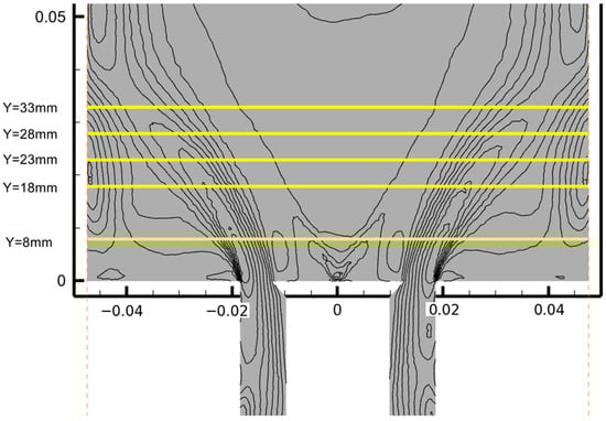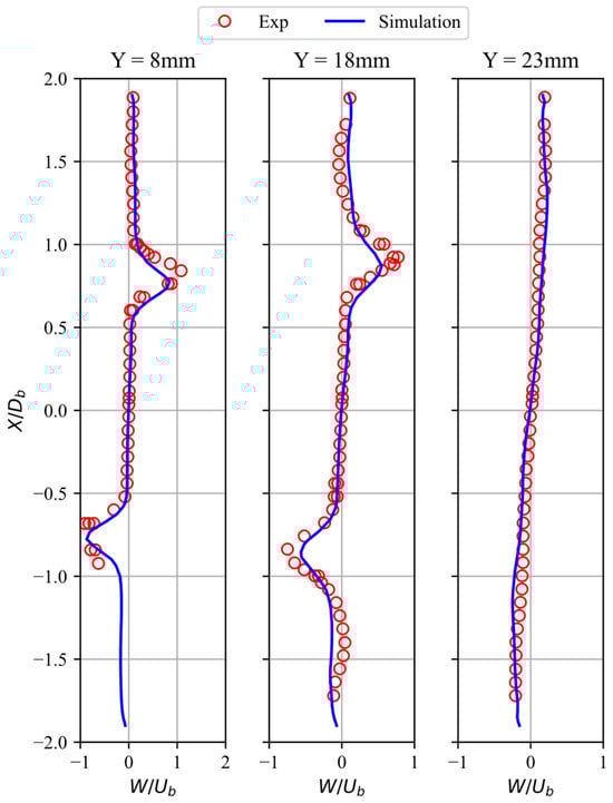 Three polyhedral mesh densities, 6.22 × 105, 1.55 × 106, and 1.9 × 106 cells, were evaluated, as summarized in Table 8. Because the reference experiments provide data over only half of the tangential domain due to axial symmetry, the numerical comparison was restricted to the same region. The assessment focused on the peak normalized axial velocity and its axial location. All meshes yielded similar trends, with errors remaining below 10%. The finest mesh, composed of 1.9 × 106 cells, produced the lowest overall error, with deviations of 0.28% in peak magnitude and 4.15% in peak location. Therefore, the 1.9 × 106-cell mesh was selected for use in the present study.