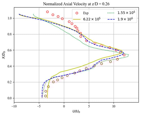 A mesh-independence study was conducted to determine the adequacy of the computational grid. Normalized axial velocity profiles at y/D = 0.26, shown in Figure 10, were compared with the experimental measurements reported in [22].