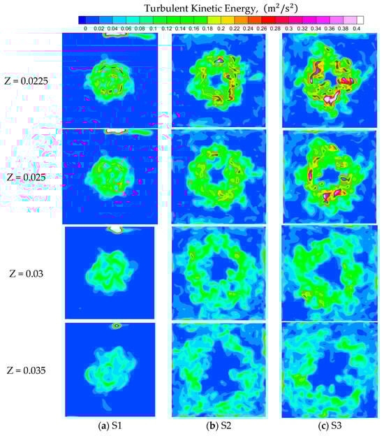 - Turbulence kinetic energy (TKE) is concentrated in the outer shear layer for high-swirl jets, forming a ring-like distribution, while low-swirl jets show centerline-concentrated TKE due to weaker jet spreading and swirl-induced shear [47,52,53].