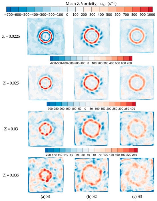 - Vorticity distributions demonstrate that higher swirl produces sharper, more coherent concentric vortical rings, whereas lower swirl results in diffuse, azimuthally distorted structures more susceptible to instabilities [46,47].