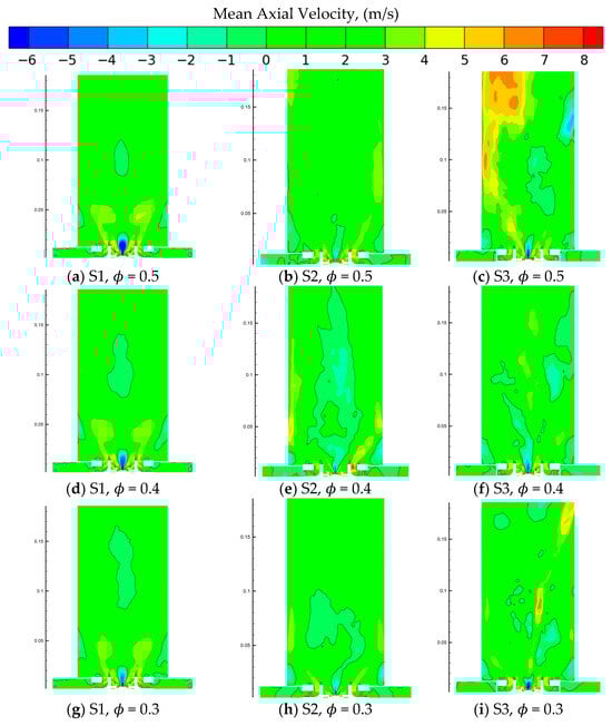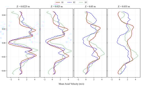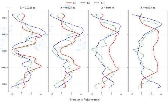 Swirl number effect on the mean axial velocity, (a) S1, (b) S2, (c) S3.