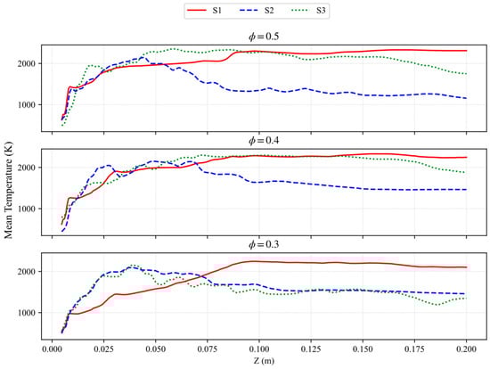 - Low swirl (S1): The flow is largely unaffected by ignition; the CRZ remains compact and robust across equivalence ratios, indicating that geometric swirl dominates over thermal expansion in setting global topology [54,55]. The flame is long and jet-like, confined to the outer shear layer, with a low-temperature core that transitions to a high-temperature region anchored near recirculation zones. Lean conditions (ϕ = 0.3) lead to global extinction.