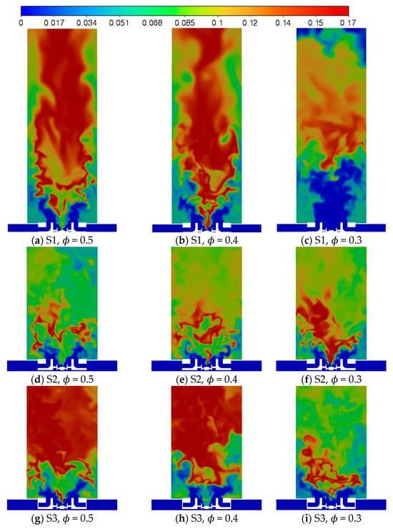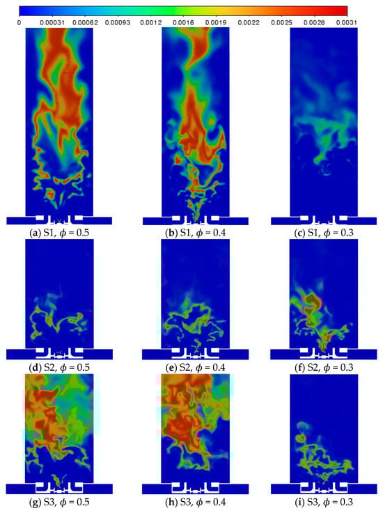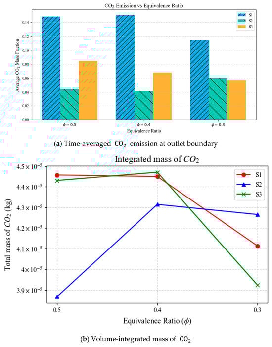 - Emissions: Moderate swirl (S2) enhances mixing and combustion efficiency, increasing CO2 production while reducing CO. Excessive swirl (S3) destabilizes the flame, reducing overall chemical conversion despite high turbulence [57,58].