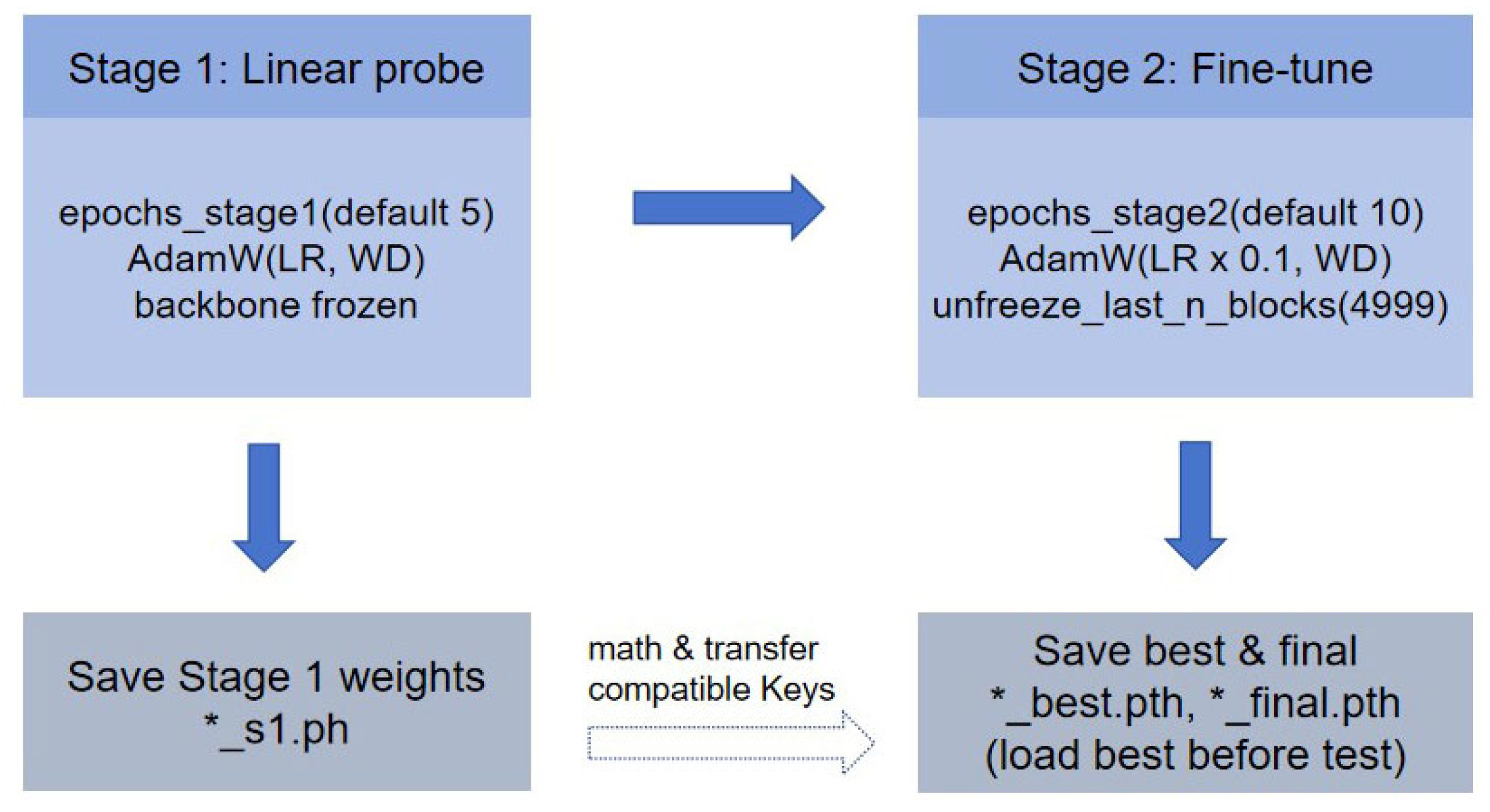 - Fine-tuning (linear_probe = False).The wrapper first freezes all parameters, then:If unfreeze_last_n_blocks >= 999: unfreeze all parameters (full fine-tuning).