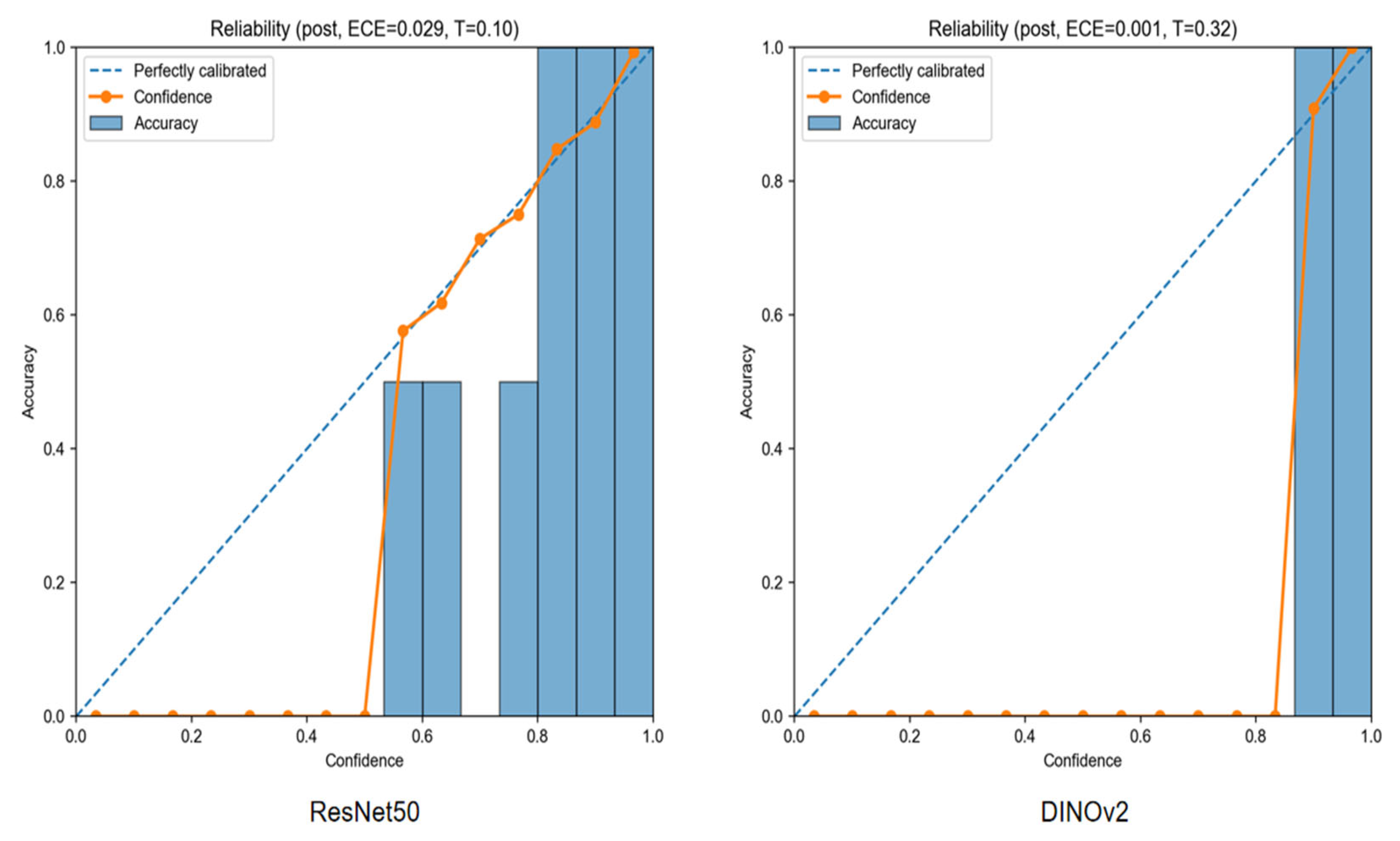 - Unmatched Reliability: The most significant contribution of this work is in model calibration. DINOv2 achieved a state-of-the-art Expected Calibration Error (ECE) of 0.08% after temperature scaling. This represents a 36-fold improvement over ResNet50 (2.90%) and a 4.5-fold improvement over EfficientNet-B3 (0.36%), proving that self-supervised ViT features naturally align closer to the true empirical probability distribution.