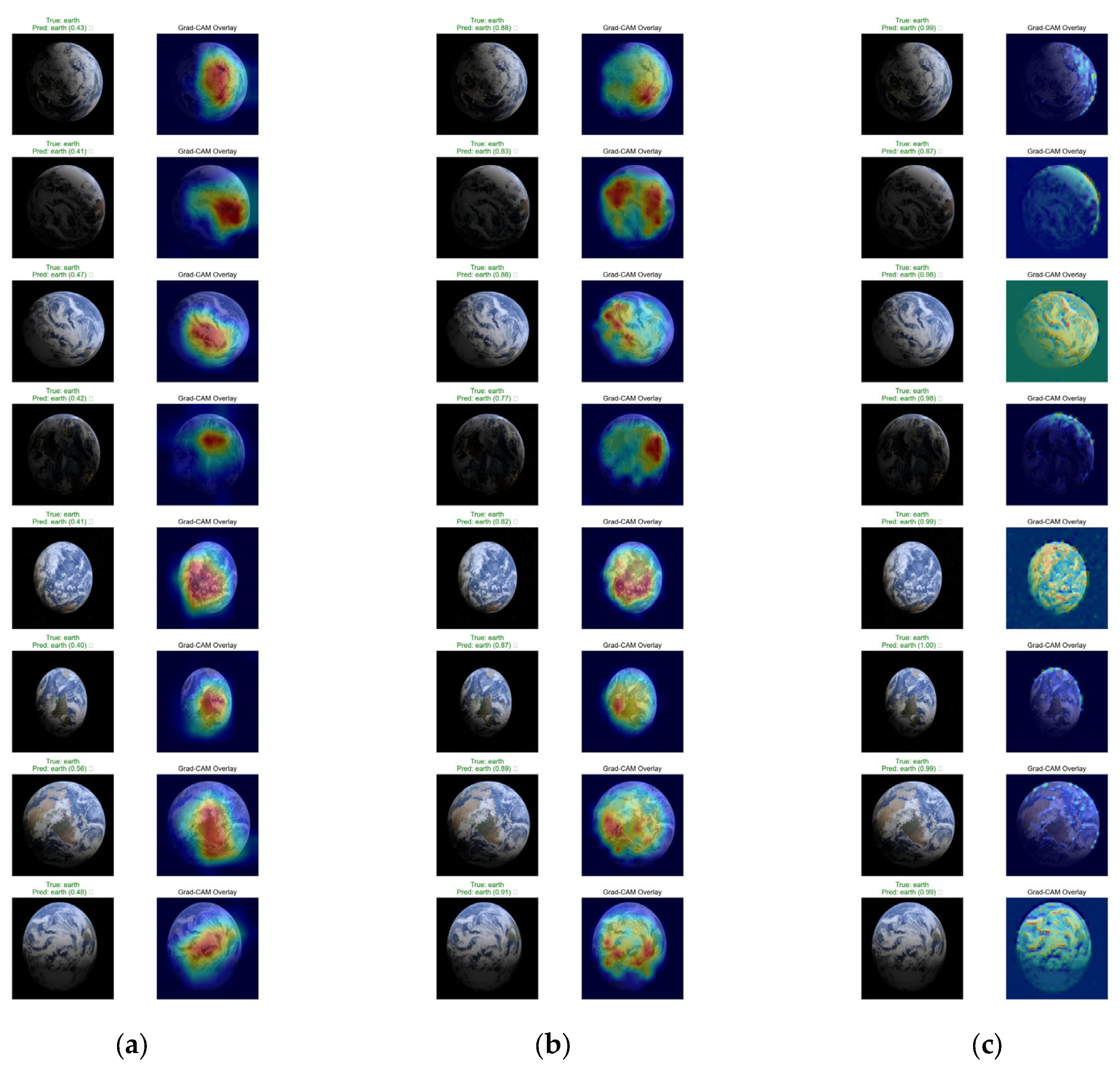 - Operational Safety: In OOD detection scenarios involving internet-sourced space artifacts, our energy-based detector achieved an AUROC of 93.7%. Qualitative analysis via Grad-CAM confirmed that DINOv2 focuses on intrinsic planetary features (e.g., surface bands, rings) rather than background noise, thereby mitigating the “shortcut learning” observed in ResNet50.