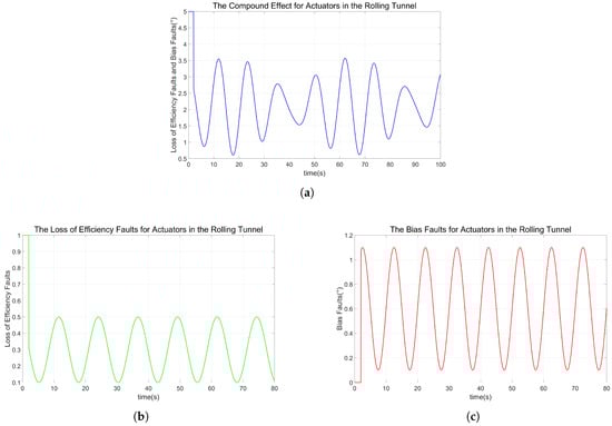 In the current experiments, the parameters of the failure regarding the loss of effectiveness, the parameters of the failure regarding deviation, the parameters of the terminal sliding face, and the parameters of the slide mode reaching laws are consistent with those parameters mentioned above, setting the moment of fault occurring to 2 s. Known in Equation (14), both the failure regarding the loss of effectiveness and the failure regarding deviation occurred in the rolling channel of actuators in the simulation at 2 s, shown in Figure 5.