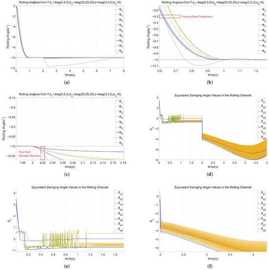 The parameters of the failure regarding the loss of effectiveness are defined as , , and the parameters of the failure regarding deviation were , , which means that the parameters of the failure regarding deviation became worse and the parameters of the loss of effectiveness remained unchanged. The simulation results of the rolling angle of the launch vehicle are shown in Figure 8a–c.