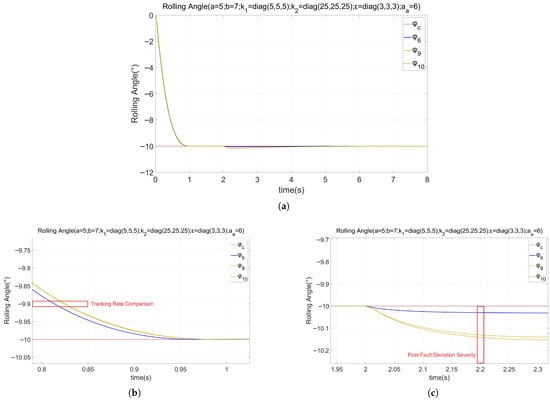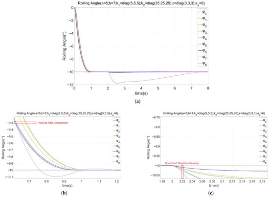 The parameters of the failure about the loss of effectiveness are defined as , , the parameters of the failure regarding deviation were , , which means that the parameters of the Loss of Effectiveness became worse and the parameters of the loss of effectiveness remained unchanged. The simulation results of the rolling angle of the launch vehicle are shown in Figure 7a–c.