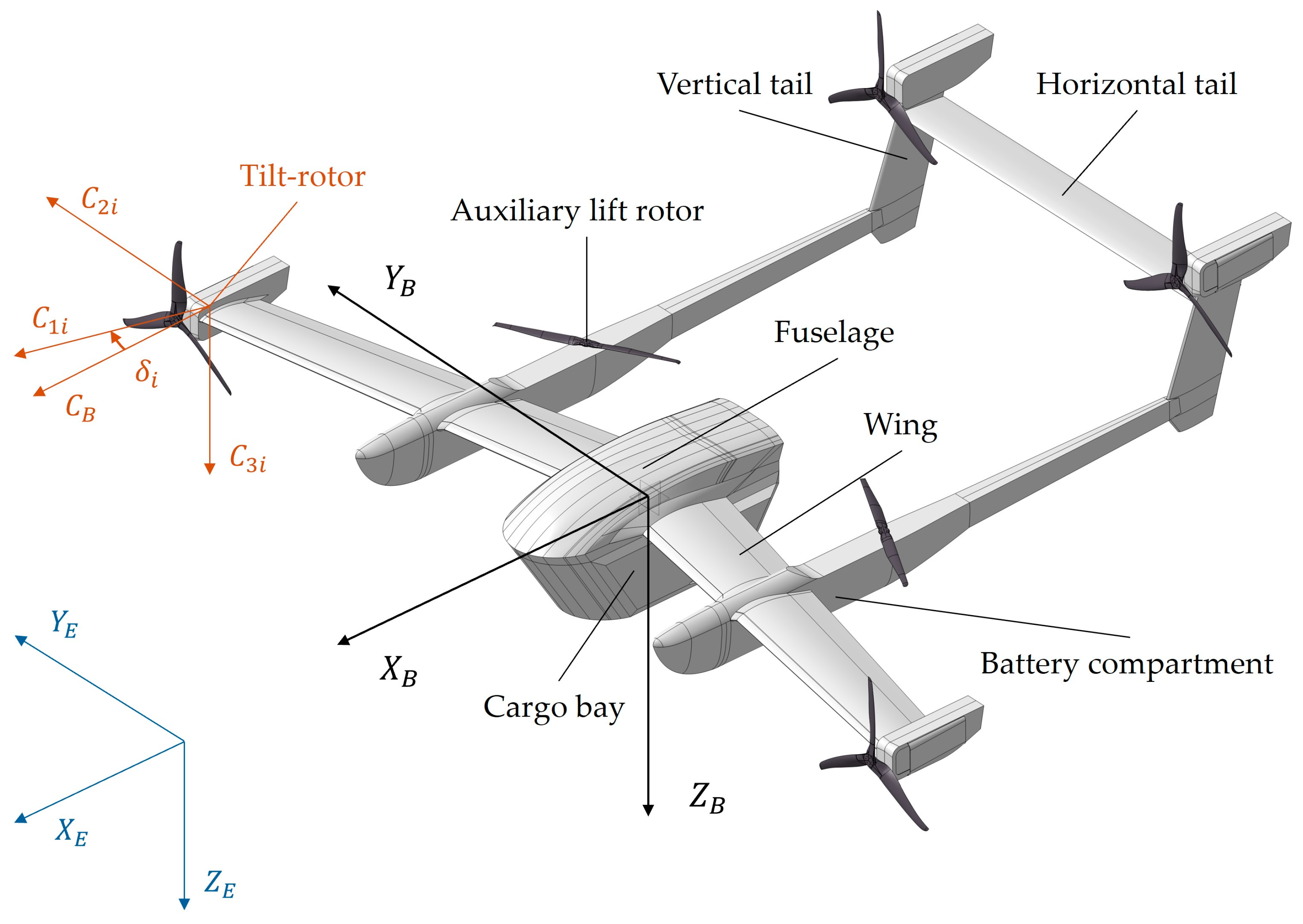 - Sheng, H.; Zhang, C.; Xiang, Y. Mathematical modeling and stability analysis of tiltrotor aircraft. Drones 2022, 6, 92. [Google Scholar] [CrossRef]
