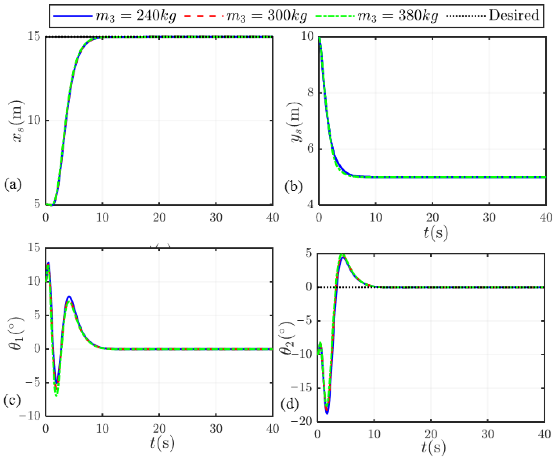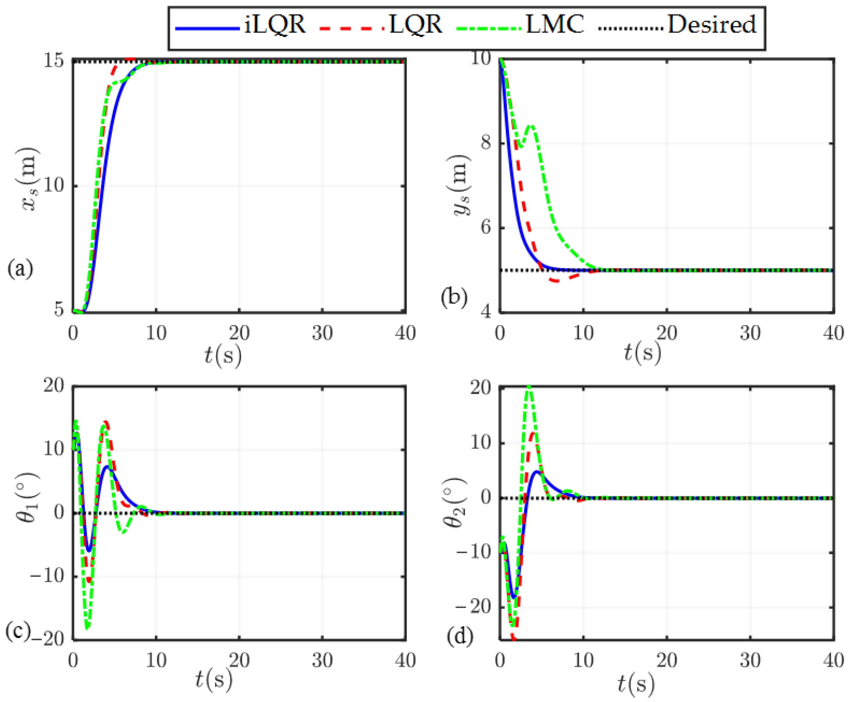 Figure 11, the iLQR controller maintains high position tracking accuracy and effective swing suppression even under variations in the suspended load mass. The state response curves are nearly identical, demonstrating their good parameter adaptation capability and robustness.