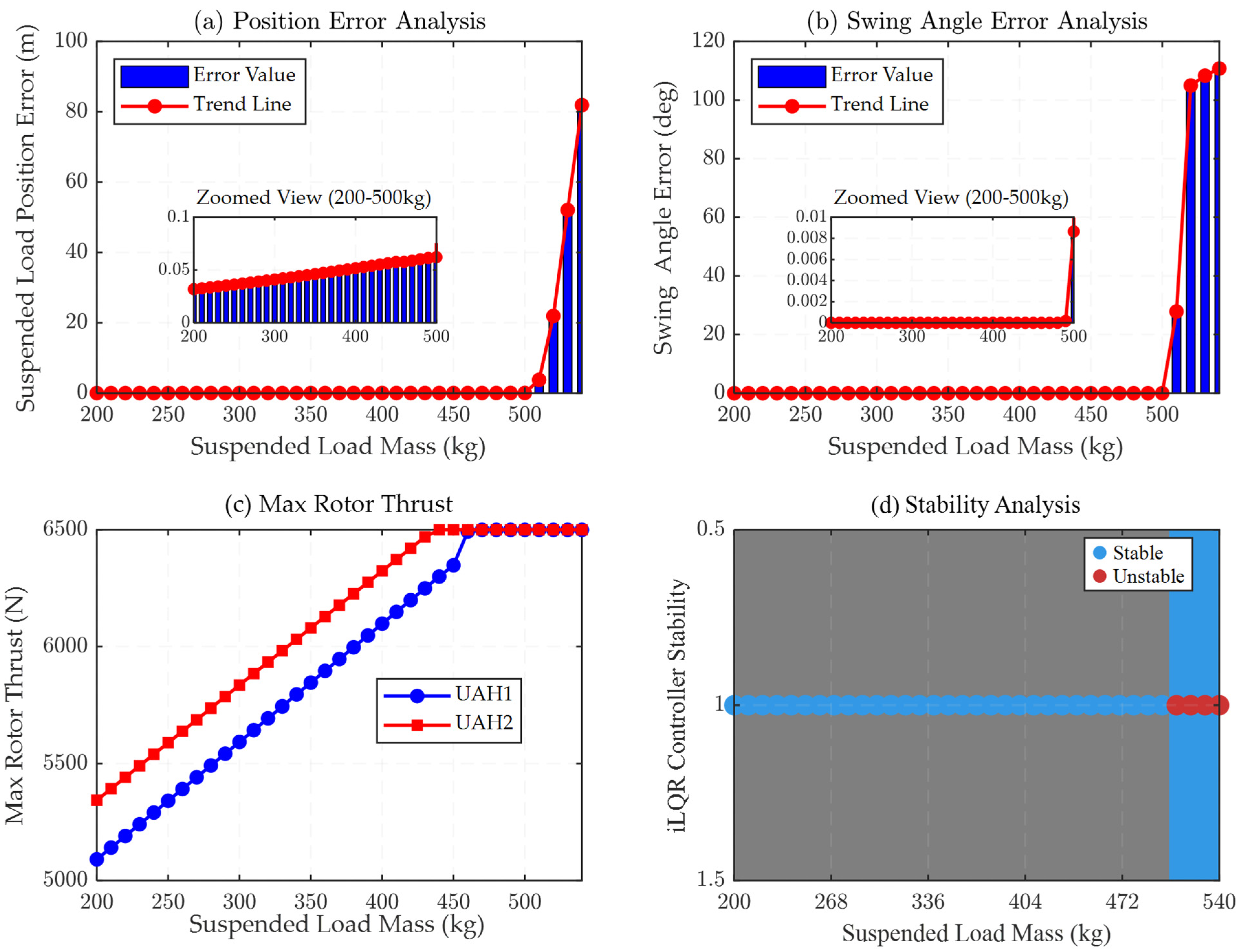 Table 6 show key simulation metrics across different suspended load masses, including the load’s final position tracking error, swing angle tracking error, maximum rotor thrust for UAH1 and UAH2, and iLQR controller stability. Integrating these simulation results, it is evident that the iLQR controller demonstrates excellent control performance and stability when the suspended load’s mass is below approximately 500 kg. It is capable of effectively maintaining system stability even in the presence of parameter perturbations. However, when the suspended load mass exceeds 510 kg, the control performance and stability of the iLQR controller significantly deteriorate, despite this mass still being below the maximum load the system can bear. Once the maximum mass of the suspended load is exceeded, the iLQR controller can no longer guarantee stability. Specifically, the iLQR controller can achieve effective control performance and ensure system stability and reliability as long as the suspended payload mass remains below 94.97% of the maximum theoretical suspended load mass.
