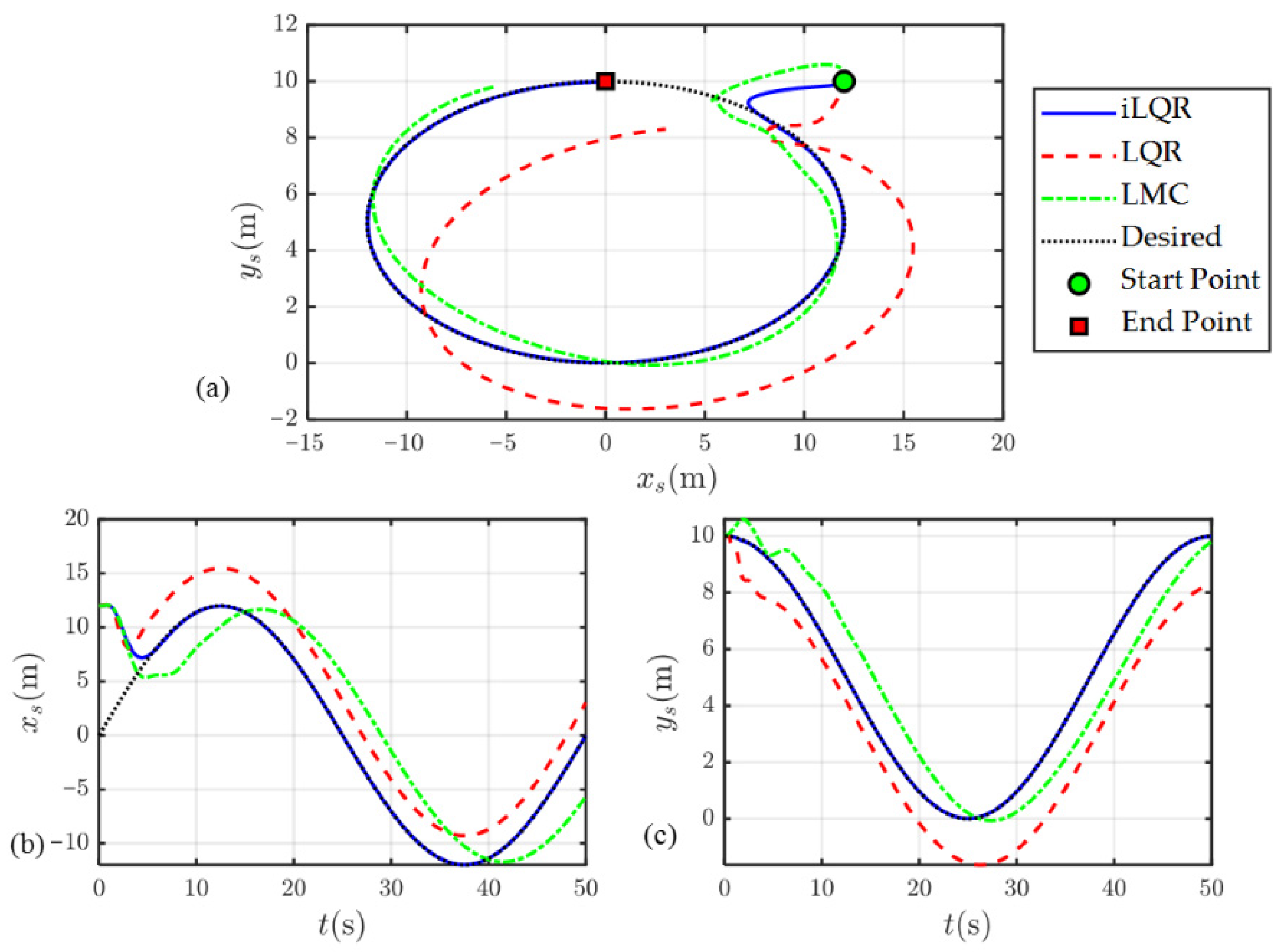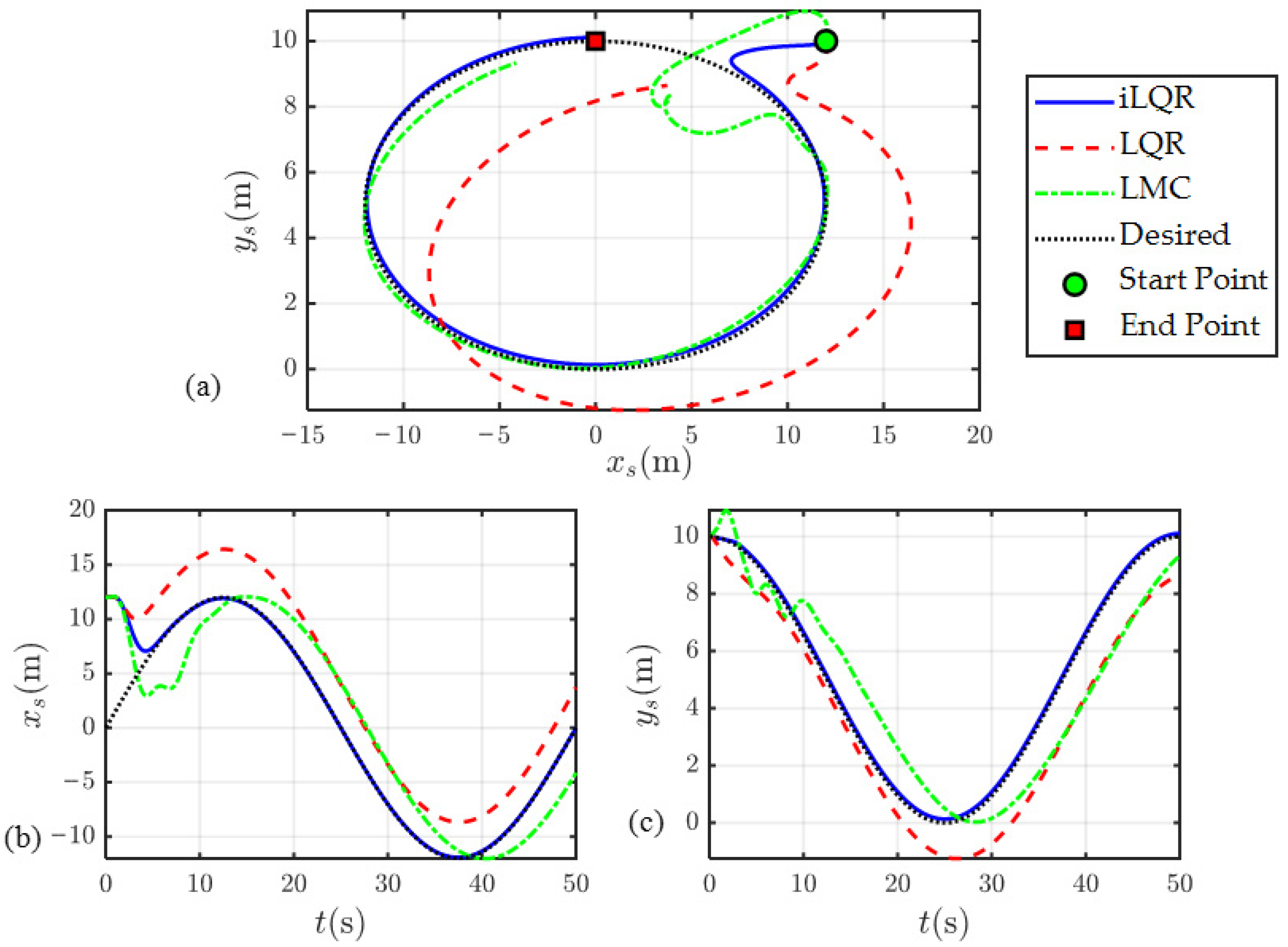 Figure 17 present the position trajectory tracking curves under the two different working conditions. It can be observed that the iLQR optimal controller enables rapid convergence to and precise tracking of the predefined reference trajectory. In contrast, the responses of the LQR and LMC controllers are relatively delayed and exhibit lower tracking accuracy. As shown in