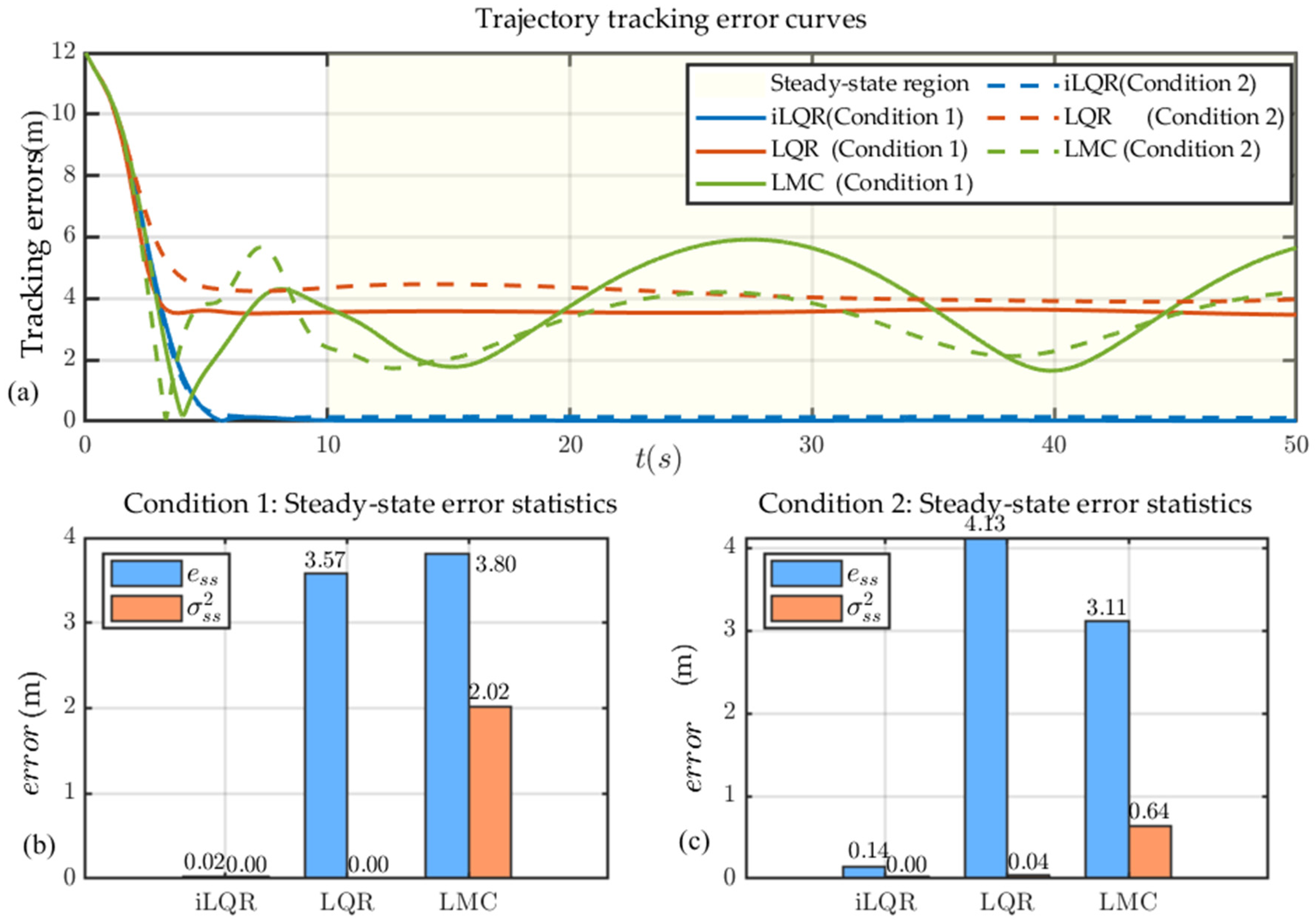 Figure 19a, under Condition 2, the tracking accuracy of the LQR controller decreases significantly. In contrast, the tracking accuracy of the iLQR and LMC controllers only declines slightly, with the iLQR optimal controller still maintaining high precision. Comprehensive analysis of
