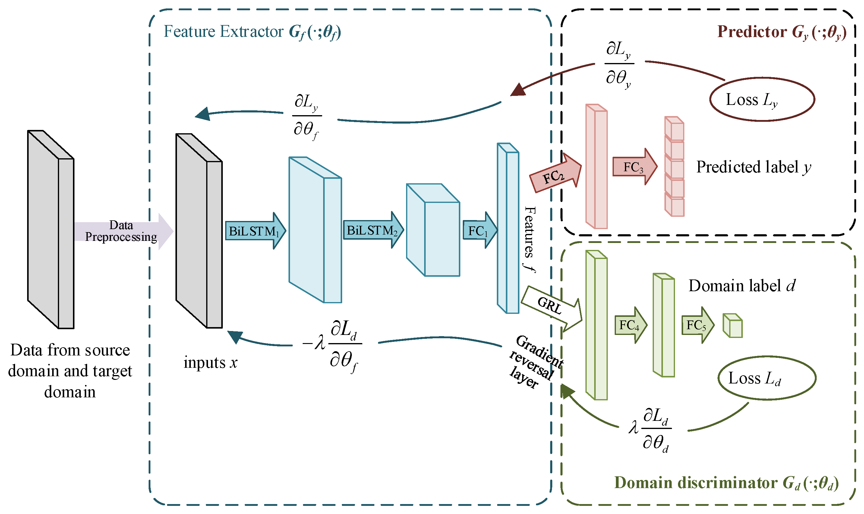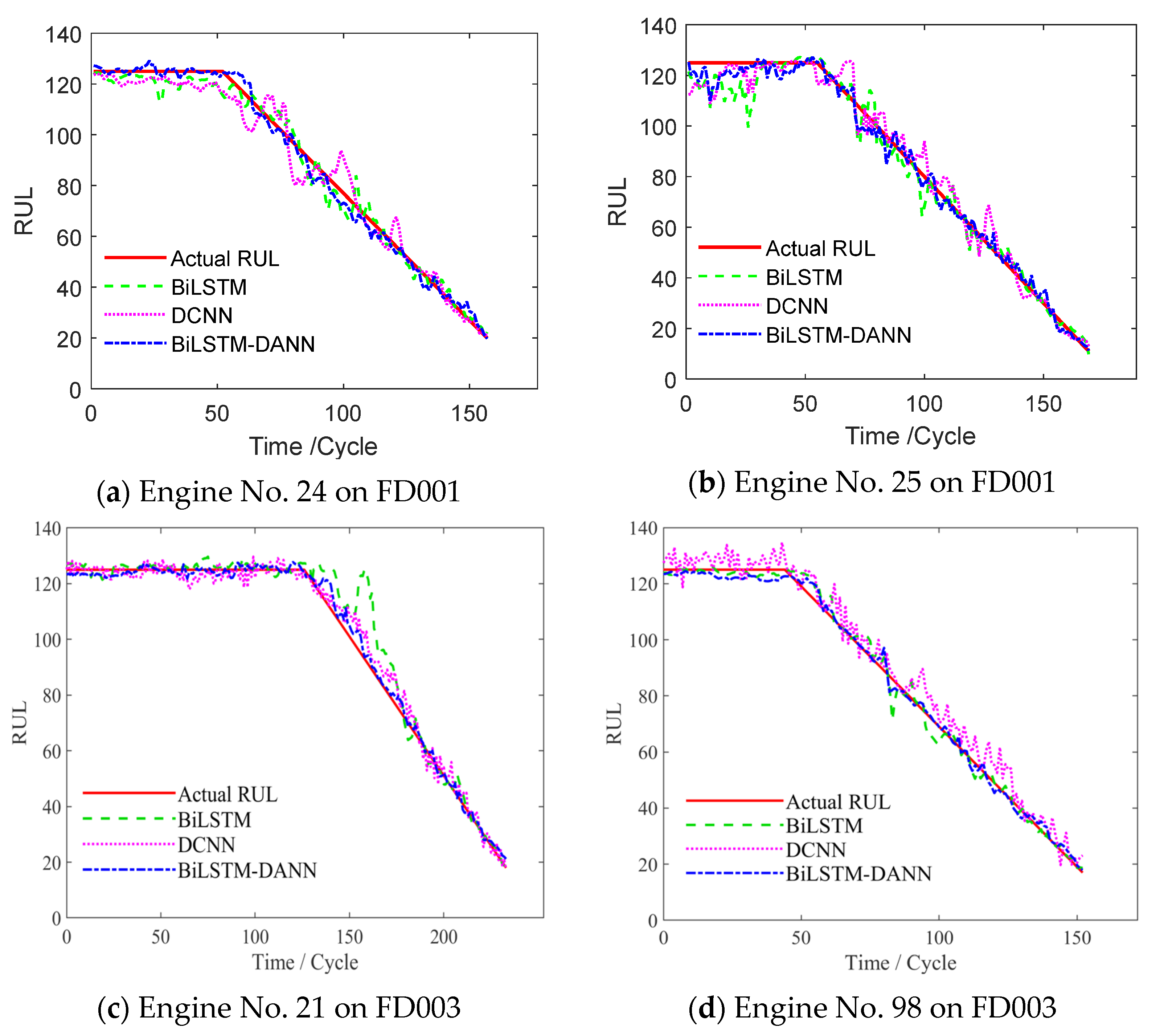 23]. Among these, DANN forces the network to learn domain-invariant features that strip domain-specific characteristics through adversarial training between the feature extractor and domain discriminator, significantly improving the model’s generalization capability under distribution differences. This method provides an important theoretical tool for solving cross-equipment and cross-operating condition prediction tasks. Summarizing the above progress, in the aero-engine field, relying on the C-MAPSS dataset, researchers have not only established mature deep learning prediction models but also developed domain adaptation technologies represented by DANN to overcome data distribution differences.