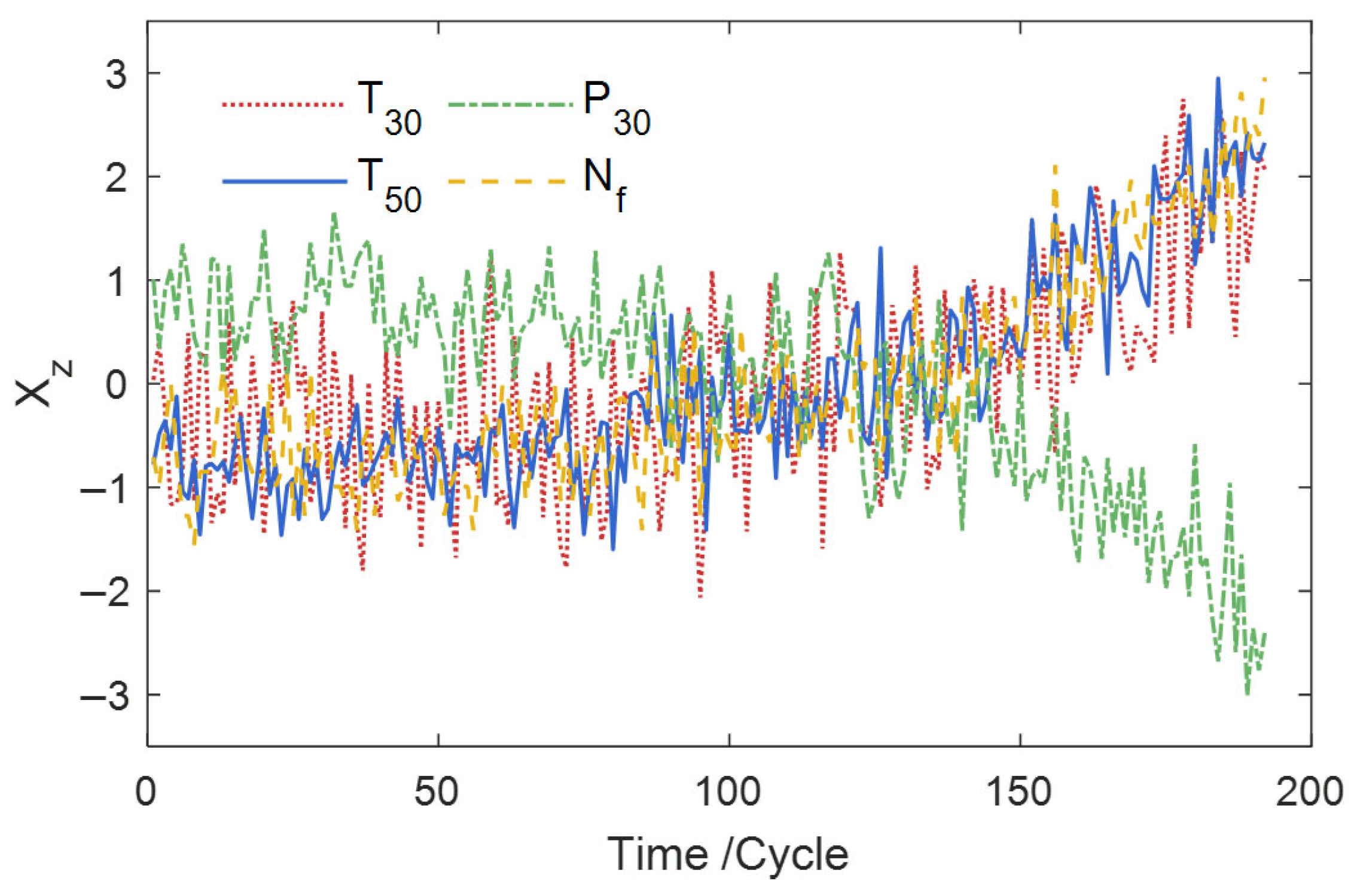 The alignment of T30 and P30 of C-MAPSS with Tc and Pc of GT is because both are located at the inlet of the combustion chamber in their respective thermodynamic cycles and are parameters characterizing the compression efficiency of the compressor. The comparison between the total temperature T50 at the low-pressure turbine outlet of an aero-engine and the exhaust temperature Tt of a GT is made because both represent end-of-cycle parameters. They integrate the overall efficiency information from the compressor, combustion chamber, and turbine, serving as comprehensive indicators of health. The comparison with the low-pressure turbine speed Nf of an aero-engine and the electrical power output Pe of a GT is based on the fact that the subject of this study is a GT used for industrial power generation. Such turbines exhibit nearly constant rotational speed after grid connection. Therefore, electrical power output, which directly reflects performance degradation, is chosen for comparison instead of turbine speed. Both are key parameters for measuring the output load.