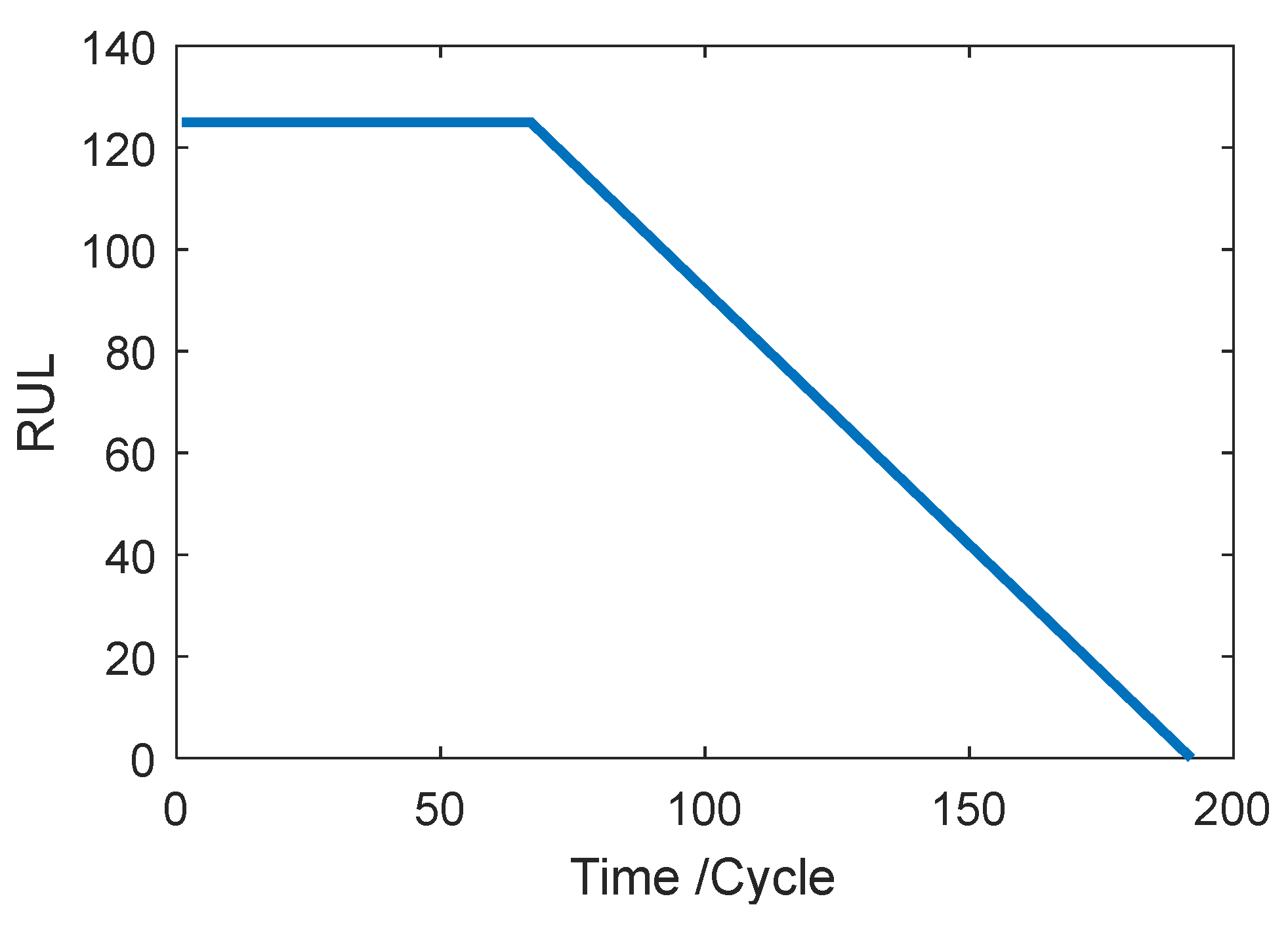 During the full life-cycle of an aero-engine, the health of the engine can be divided into two stages. In the first stage, the early operation period, the engine health is relatively stable, and the RUL remains at the maximum value RULmax. In the second stage, the engine performance degrades, and the RUL shows a linear decreasing trend until it drops to 0. Therefore, the change trend of RUL with the operating cycle