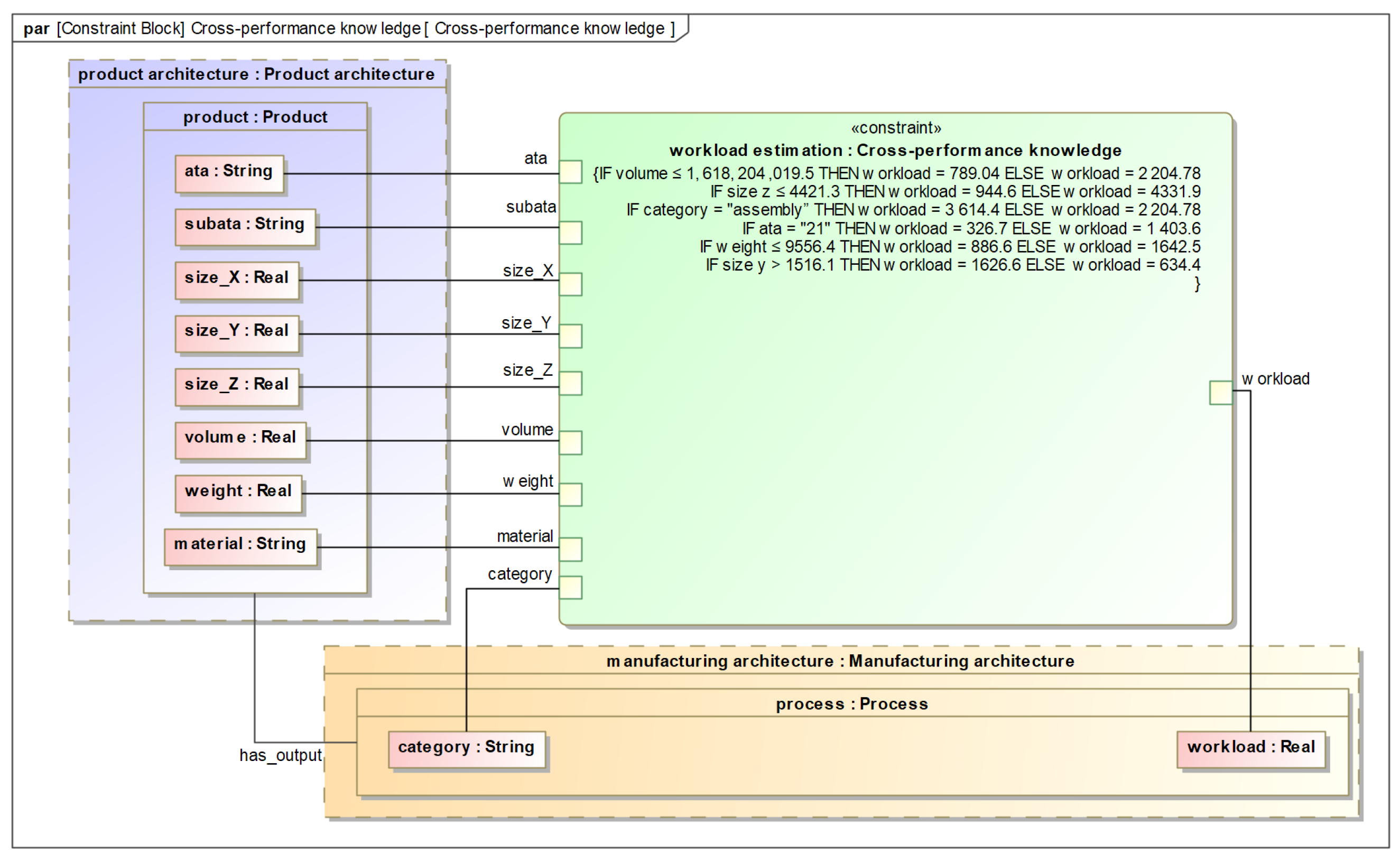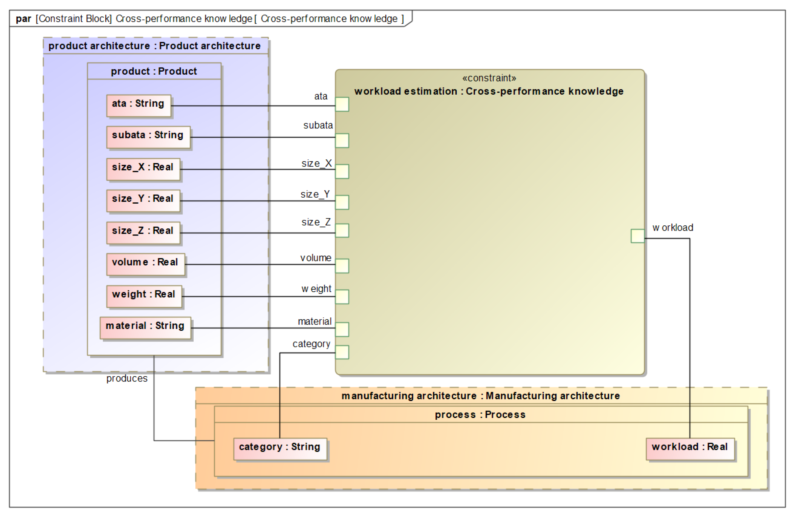 Expert-centric knowledge formalization was performed through several modeling sessions with key domain stakeholders in a real-world use-case study. Within the framework of the MfM methodology, and by exploiting the modeling capability of Model-Based Systems Engineering, a SysML model was developed to identify the key concepts and attributes fundamental to workload estimation. This cross-domain knowledge pattern acted as an additional bridge between product and manufacturing system architectures.