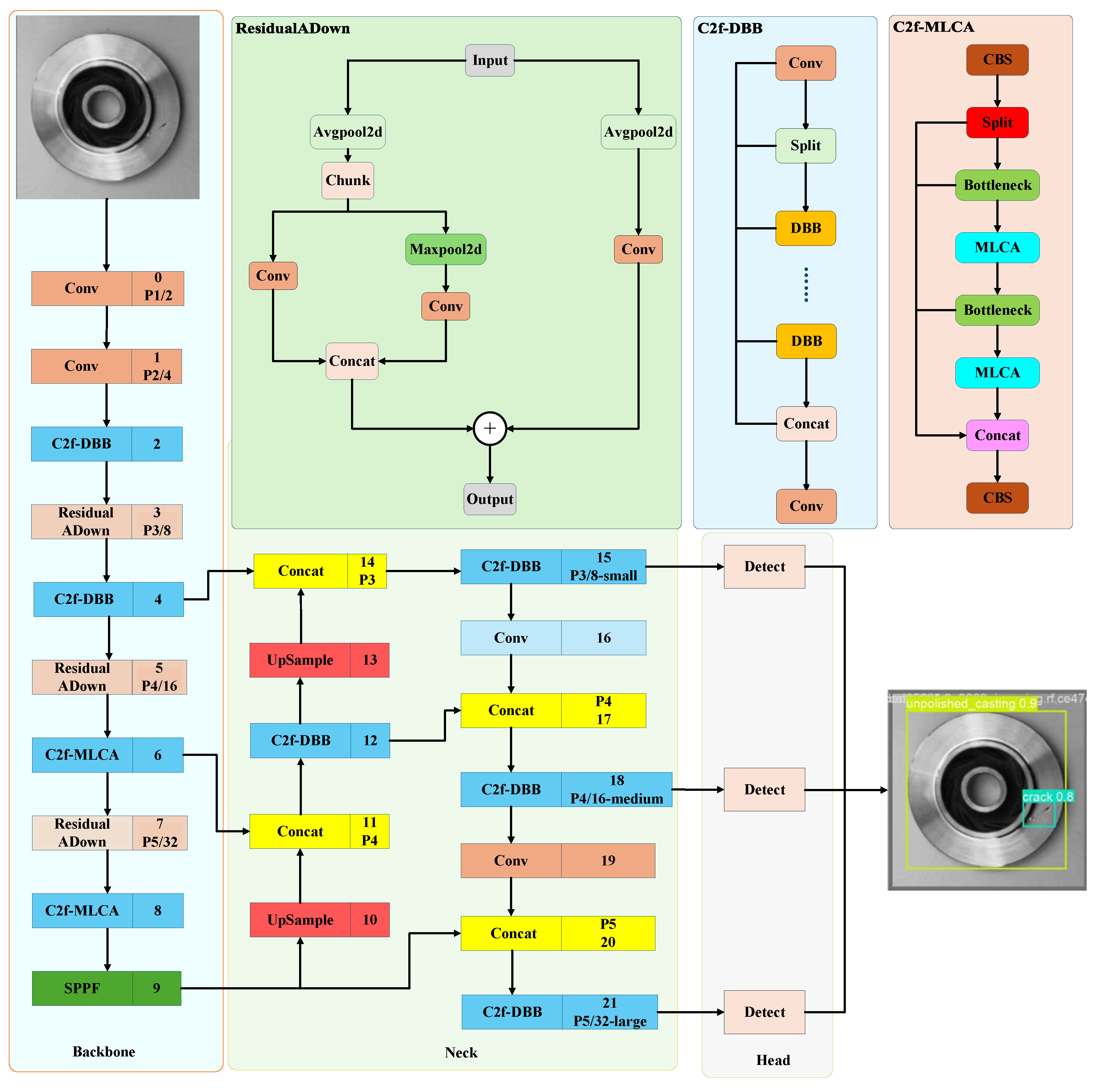 Specifically, the C2f-DBB module enhances the diversity and adaptability of feature extraction, enabling better representation of irregular defect patterns. The C2f-MLCA module further refines these features by selectively emphasizing informative channels and suppressing background noise. Meanwhile, the ResidualADown module preserves critical spatial information during downsampling, ensuring that subtle defect details are not lost in deeper layers. Through this complementary design, the three modules form a synergistic pipeline of “feature enhancement—feature selection—information preservation,” which leads to more robust detection performance compared with isolated or naively combined improvements.