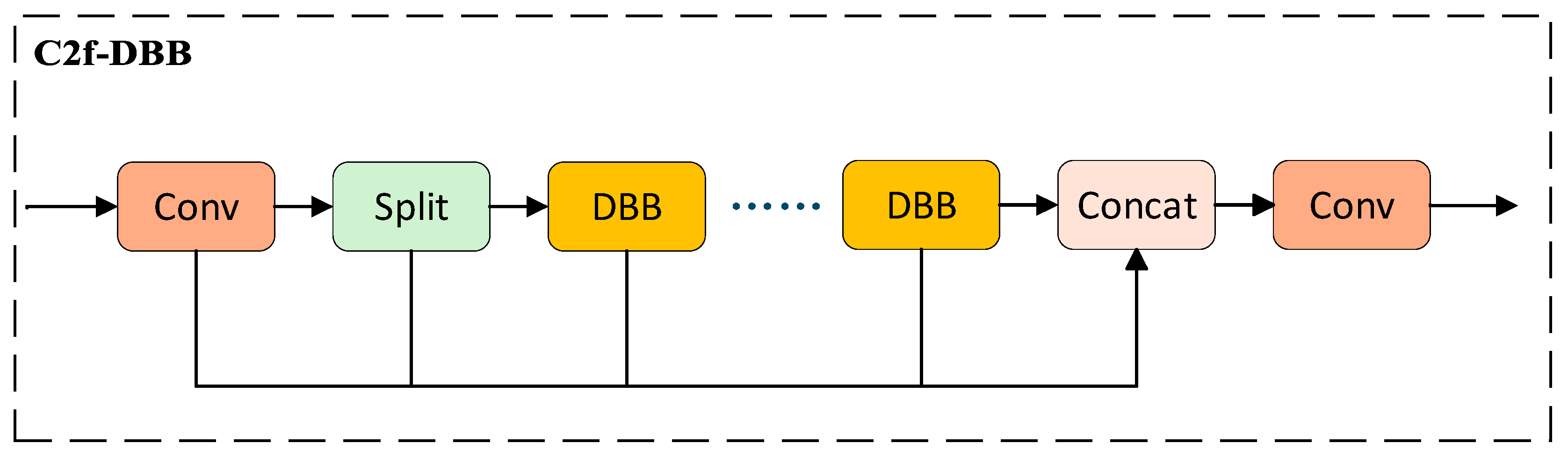 In C2f-DBB, the standard convolution operations within the Bottleneck structure are replaced with a multi-branch convolutional design. By incorporating parallel branches with heterogeneous convolution kernel, the module enhances the diversity of feature extraction at multiple receptive fields. This design enables more effective representation of small, irregular, and multi-scale defect patterns. Meanwhile, the multi-branch structure is equivalently fused into a single convolution during inference via structural re-parameterization, ensuring that no additional computational overhead is introduced. As a result, the proposed module improves feature representation capability while maintaining high inference efficiency, making it suitable for complex industrial defect detection scenarios. The structure of C2f-DBB is illustrated in