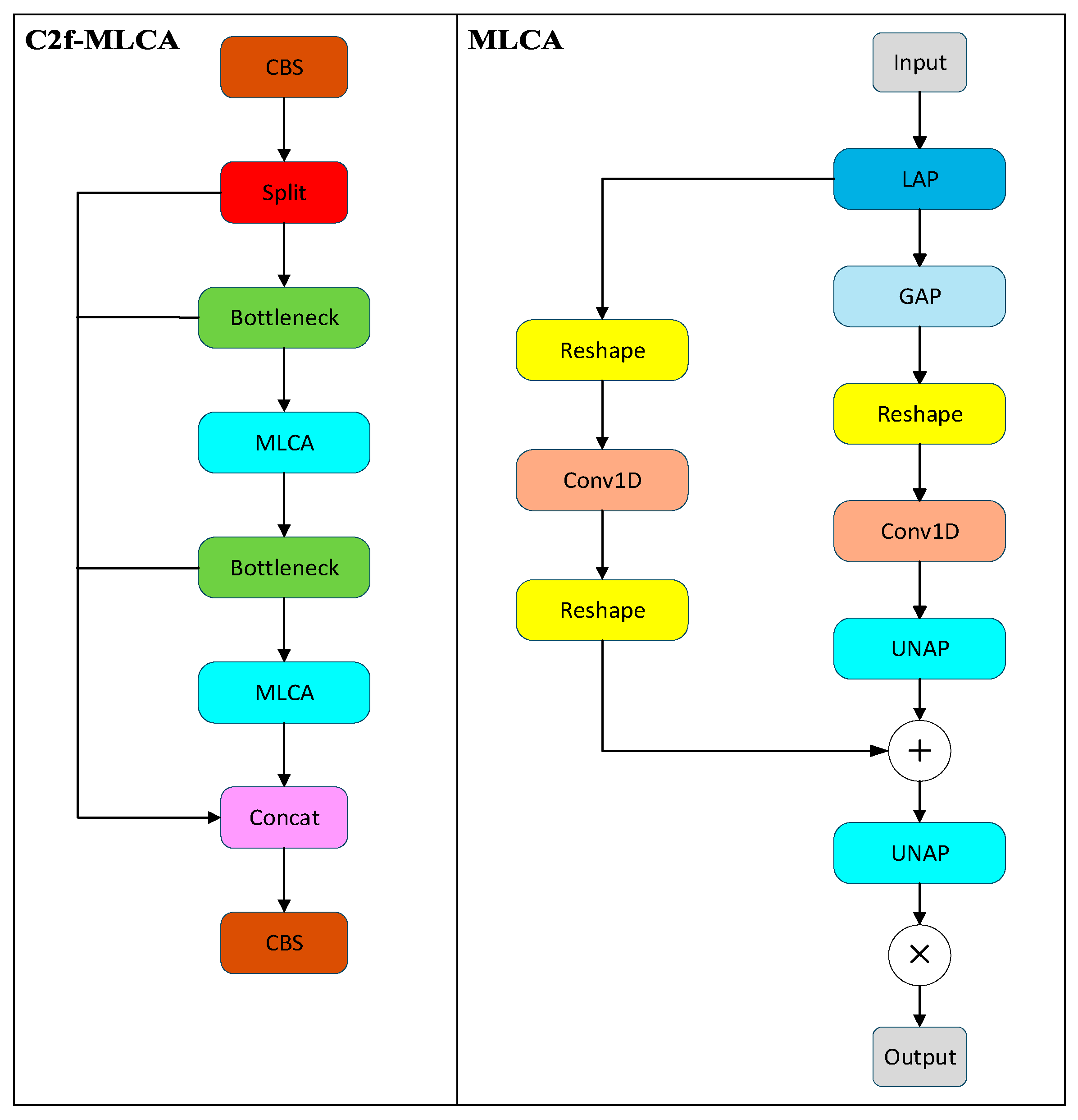 In this work, the MLCA algorithm is integrated into the original C2f module to form the C2f-MLCA module. This integration enhances the network’s ability to perceive both channel and spatial information without significantly increasing computational complexity. The introduction of this module effectively improves feature extraction capability and strengthens the network’s performance in detecting targets of varying scales.