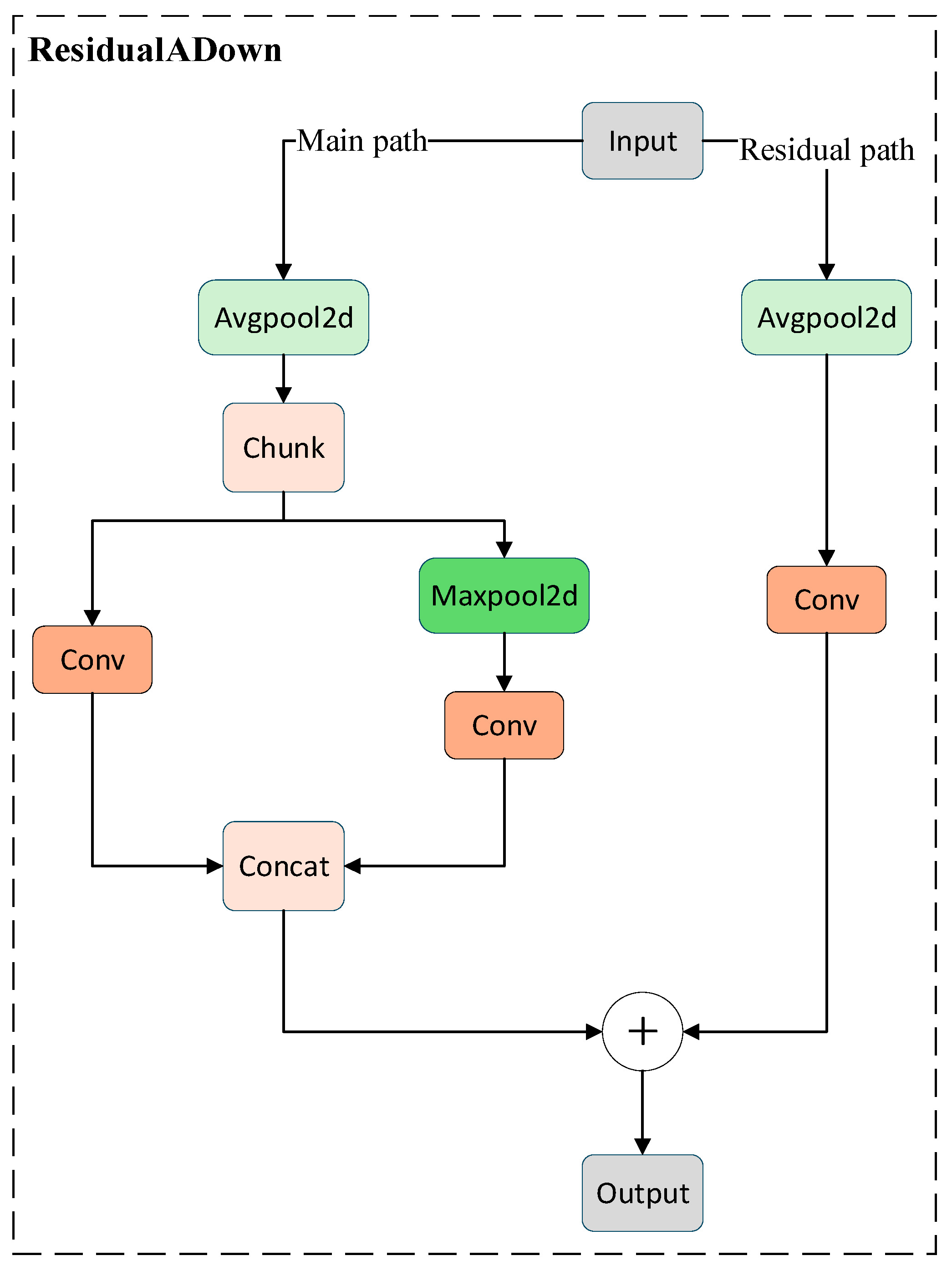 Downsampling operations in convolutional neural networks often lead to the loss of important feature information. To address this issue, a ResidualADown module is designed to improve feature propagation during the downsampling process. By introducing a residual connection, the proposed module can effectively preserve useful feature information while reducing spatial resolution, thereby enhancing the representation capability of the network, as illustrated in