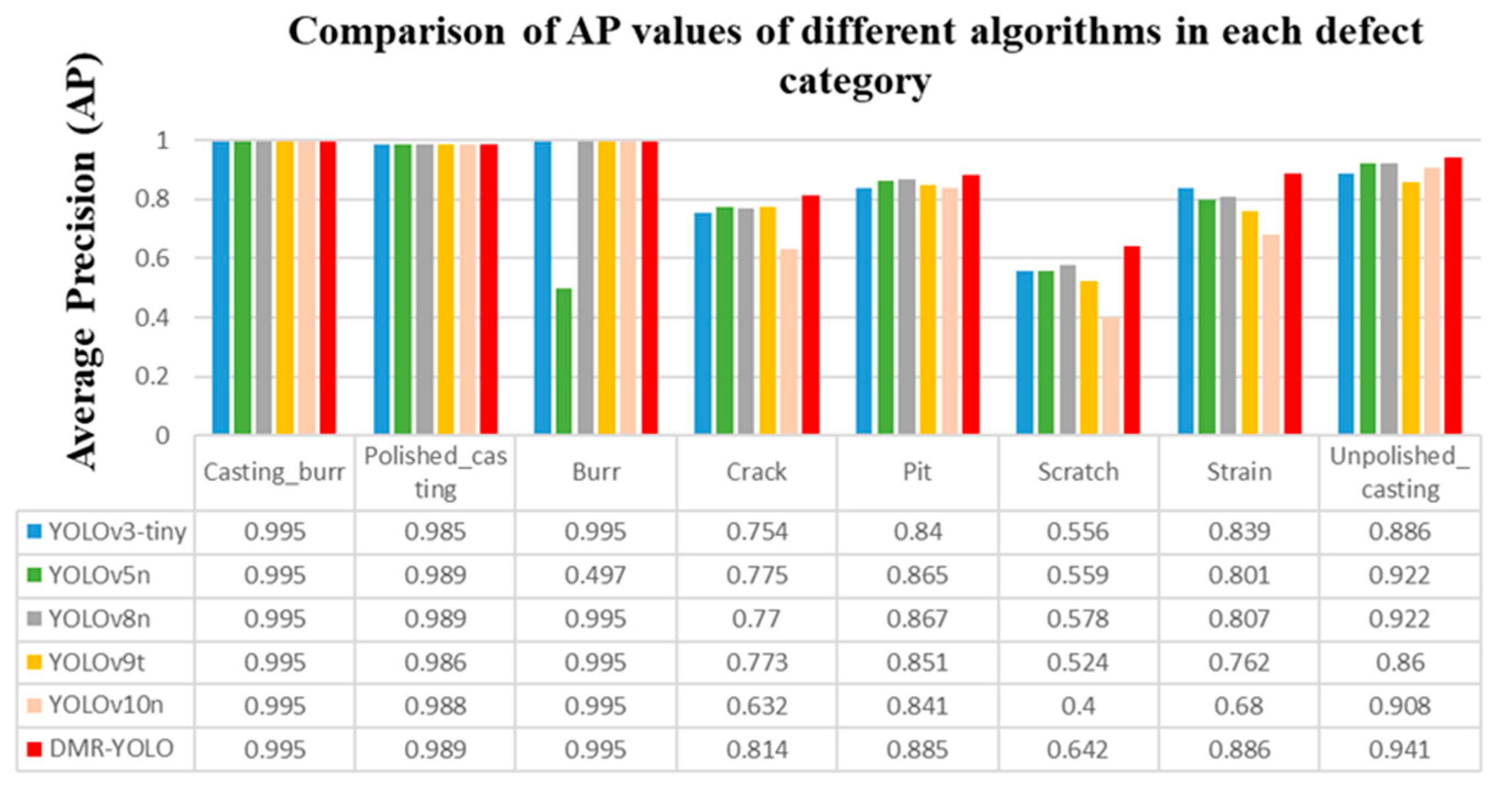Figure 8 provides an intuitive comparison of the average precision (AP) of different YOLO-series algorithms and the proposed DMR-YOLO model across eight categories of bearing surface defects. Overall, all models perform exceptionally well on categories such as Casting burr, Polished casting, and Burr, with AP values approaching or exceeding 0.99. This indicates that these defects have relatively distinct visual characteristics, making them easier to detect. However, for categories including Crack, Pit, Scratch, Strain, and Unpolished casting, significant differences in performance among the models are observed. Notably, the proposed DMR-YOLO achieves the highest AP values in most of these challenging categories, with particularly marked improvements in Crack, Scratch, and Strain. These results demonstrate that the introduced enhancements effectively strengthen the model’s ability to recognize subtle cracks, scratches, and deformations that are typically difficult to detect. This figure, therefore, validates at the category level that DMR-YOLO maintains high robustness while achieving superior sensitivity and generalization for hard-to-detect defects.