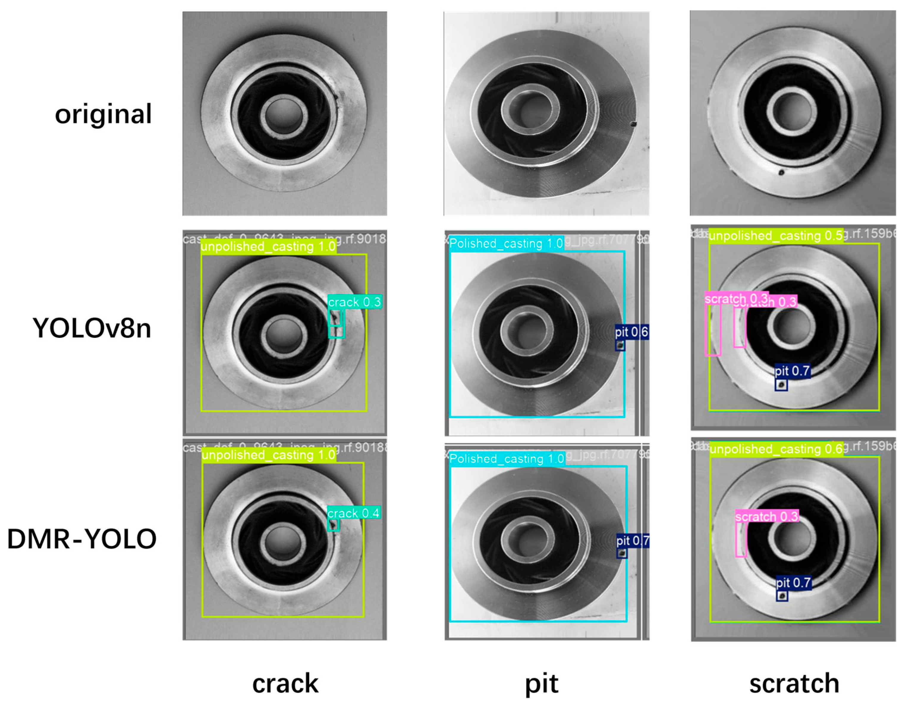 Figure 9, detection results from the baseline YOLOv8n model and the proposed DMR-YOLO model are displayed alongside the original images. It is clearly observed that the improved model significantly reduces missed detections and false positives, while enhancing both localization accuracy and classification confidence. These instance-level visualizations further confirm the enhanced practical applicability and reliability of the proposed DMR-YOLO model in real-world industrial defect detection.
