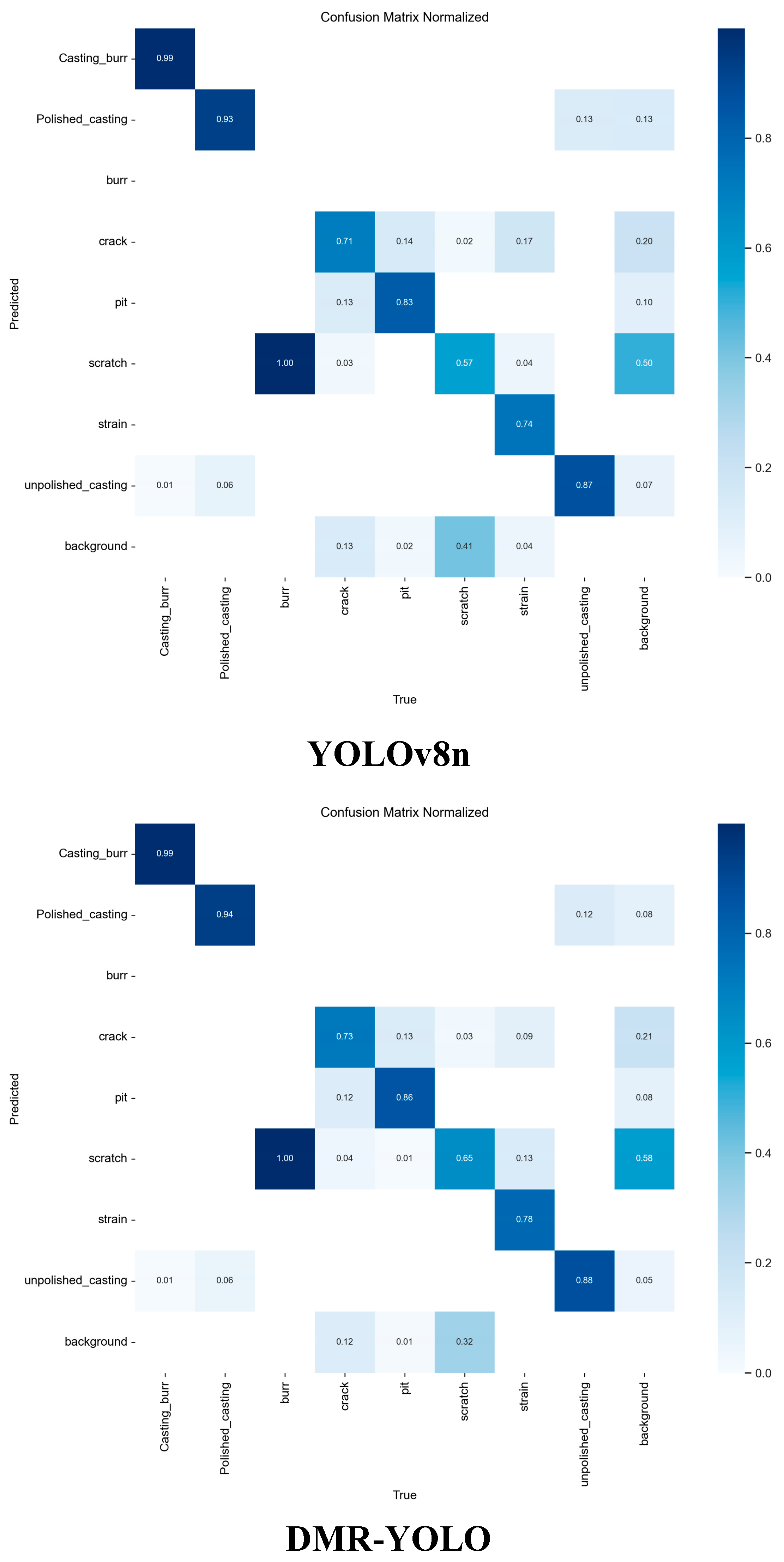 Figure 10. In the confusion matrices, the rows represent the ground-truth classes, while the columns correspond to the predicted classes. The main diagonal reflects the correct recognition rate for each defect category, whereas the off-diagonal elements indicate misclassification rates. From the comparison, it is evident that the main diagonal of the DMR-YOLO confusion matrix exhibits darker color intensities and higher numerical values compared to YOLOv8n, indicating a higher correct detection rate across all bearing defect categories. The improved model shows notable gains in detection accuracy, particularly for Scratch and Strain defects, where precision increases from 57.8% and 80.7% to 64.2% and 88.6%, respectively. Overall, the mean average precision (mAP) across all defect categories rises from 86.5% to 89.3%, representing an improvement of 2.8% in detection accuracy.