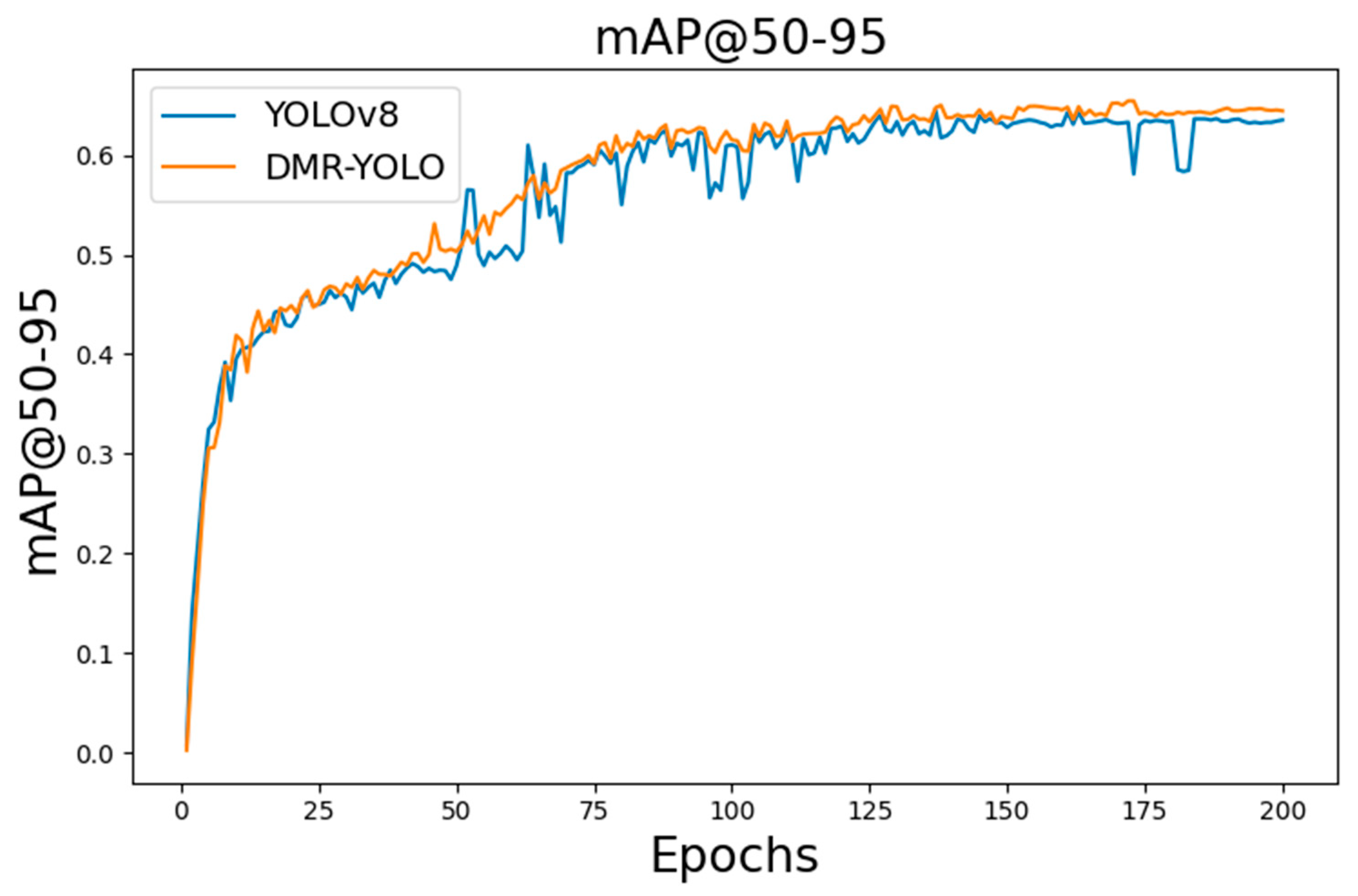Figure 11 illustrates the epoch-wise progression of mAP@50-95 for both YOLOv8 and DMR-YOLO across 200 training epochs. DMR-YOLO exhibits a generally higher mAP@50-95 than the baseline, particularly after the initial 50 epochs, and shows a smoother convergence trajectory, suggesting improved stability. The persistent performance advantage indicates that the gains introduced by DMR-YOLO are reliable under identical experimental conditions. Overall, DMR-YOLO achieves a favorable balance of detection accuracy, stability, and computational efficiency, with a modest increase in model size (3.60 M parameters) and computational cost (10.6 GFLOPs) compared to YOLOv8.