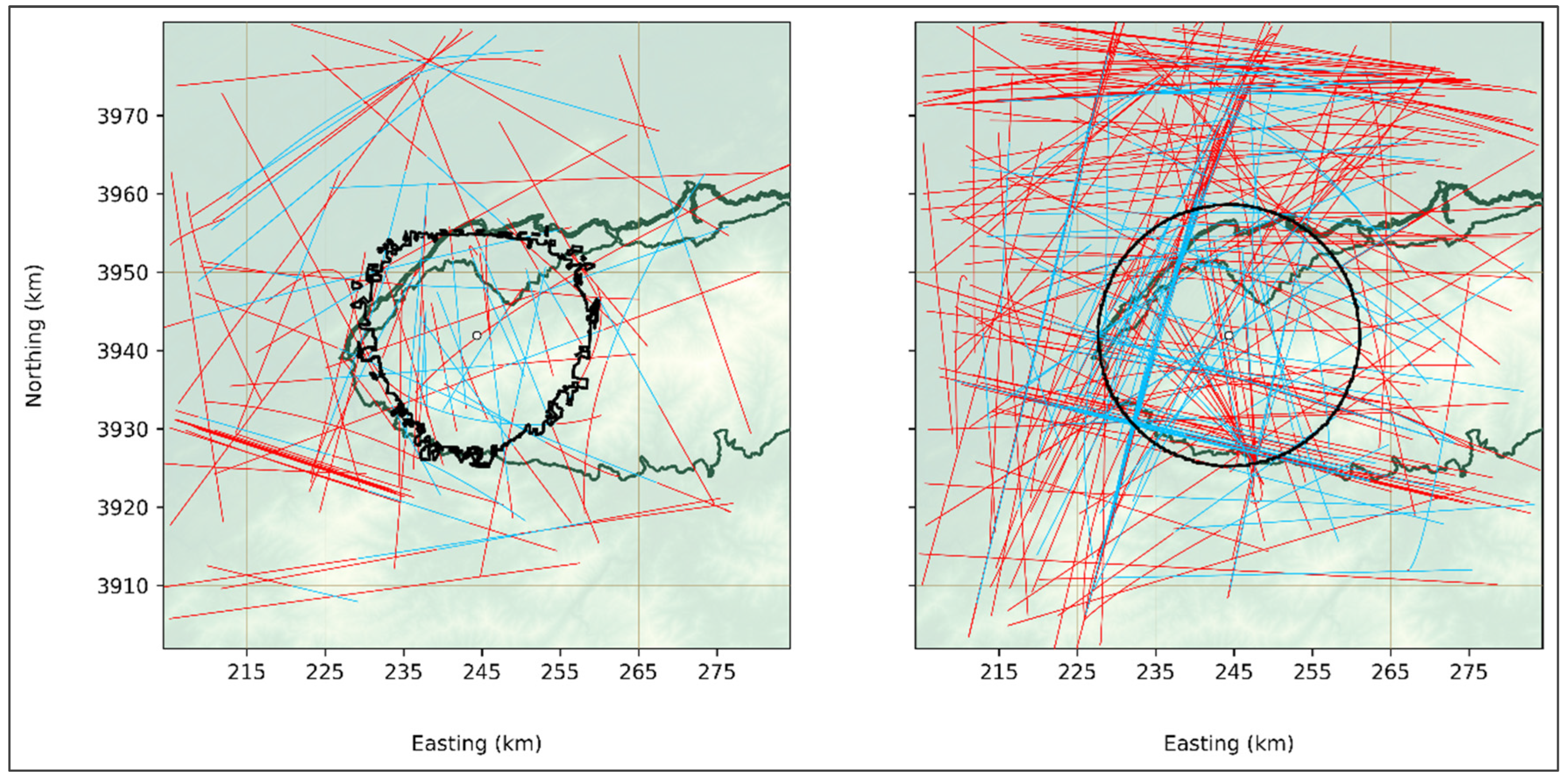 | 35 < Lp ≤ 52 dB | 17.2 km (10.7 mi) | 13.8 km (8.6 mi) | 3594 |