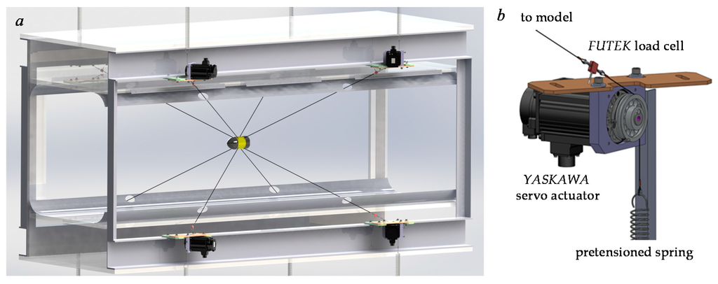 During the system design phase, several different types of motor actuators were considered for this application. Gear motor actuators could provide more output torque than the direct-drive configuration, but they would have too much inertia to meet the dynamic response goals. All types of linear actuators examined had limitations with response speed or maximum achievable wire rope tension, where the design goals for motion are 50 Hz controlled motions of model deflections of up to 5 mm, and wire tensions of up to 110 N. A vane-type hydraulic rotary actuator would be a compact, high torque, and high response rate solution, but it would require a hydraulic reservoir and pressurization system, and it was deemed less applicable compared to the realized rotary servo actuator shown in Figure 1b, although it would also achieve all of the design goals.