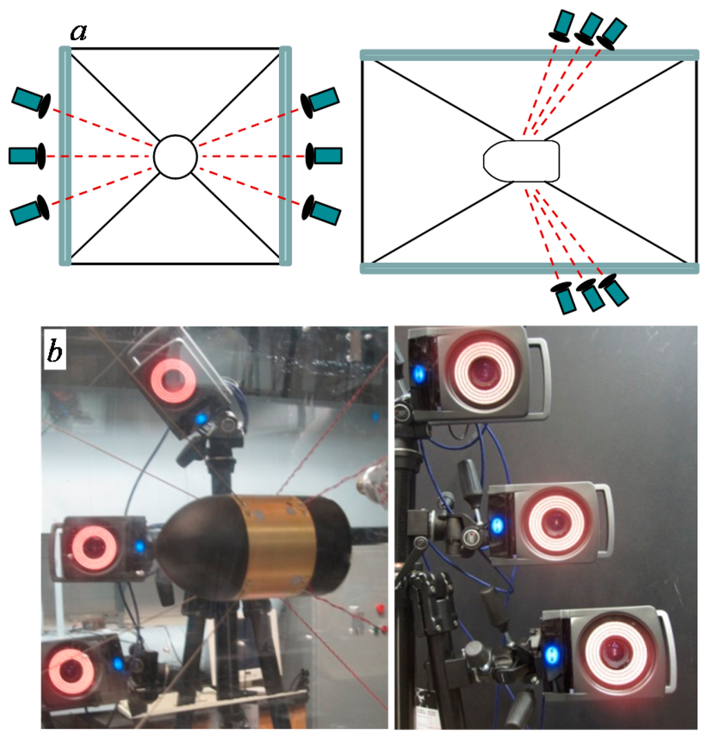 Schematics (a) and images (b) of the motion analysis system camera orientation.