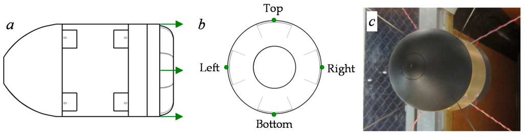 A secondary requirement for this traverse is that it can provide electrical power to the wind tunnel model to enable future use of flow control applications. In the axisymmetric model example, four independently-driven synthetic jet actuators (labeled the top, left, bottom, and right actuators, as shown in Figure 3b) would be, in principle, integrated and distributed along the perimeter of the tail section, as they would comprise the flow control components in a follow-up study. The electrical power that would be used as a source for the synthetic jets is routed through weaved positive voltage lines (30 AWG) along the mounting wires on the downstream end of the model (shown in Figure 3c), where the entire system is grounded.