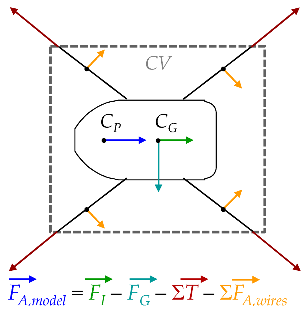 The real time wire tensions measured through the load cells are used to extract the aerodynamic forces and moments on the model. This is realized by using a free body diagram in a control volume (CV) shown in Figure 6, where the aerodynamic forces are calculated by the inertial force, , of the model (acting at the center of gravity, CG, and calculated from its estimated acceleration) with all other forces subtracted. These other forces include the weight of the model (, acting at CG), the tension in the wires, , and the estimated aerodynamic drag of the wires alone, . The latter is calculated assuming the wires are cylinders with pure form drag (CD = 1.25) and no friction drag, using the real time location of both the model and motor wire ends and calculating the normal projection of the flow. It is noted that each wire force is estimated as acting on the midpoint between the tunnel flange and the respective real time location of the wire mount on the model, and acting in the direction normal to the wires. The resultant force is the aerodynamic force on the model, , and a similar approach can be used to determine the moments by weighting each force by the location at which it acts. Measurements of the aerodynamic forces for the axisymmetric body using this force balance are presented in Section 3.2. The current trajectory-tracking controller described in this section restricts the model to a prescribed trajectory, where the model has a negligible response to external aerodynamic forces (where the disturbance force is on the order of ~1 N, and the spring constant of the cables are on the order of ~100,000 N/m). It should be noted, however, that a free flight controller can instead be designed where the model would respond directly to the disturbance forces (by using the load cells as the primary feedback instead of the encoders and camera signals), but a more aggressive controller would have to be implemented in the inner loop to induce dynamics that do not significantly lag the induced forces, and this type of controller is considered for future work.