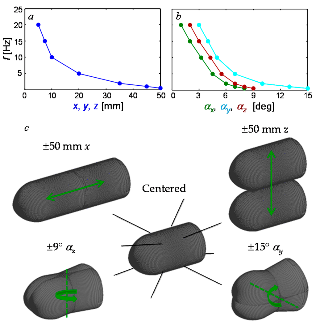 The system dynamic performance is characterized in terms of displacement range and frequency of sinusoidal commands, and is depicted in Figure 7. Although the mounting points of the wires on the motors and the model determine the ideal maximum range of motion with limitless tension and unbreakable wires, this range diminishes for a fixed maximum tension. This range is also frequency dependent and diminishes with higher frequencies as the wires have to support an accelerating model with a larger inertial force. Therefore, the current controller is tested with a range of frequencies and the maximum range of motion in all six degrees of freedom is measured with a maximum wire tension of 110 N, and the results are shown for translations and rotations, in Figure 7a,b, respectively. This frequency response is dependent on all of the aforementioned geometric and controls parameters and can be further optimized by modifying these parameters, if necessary. The measured displacement amplitude that is realized is 50 mm in translation (x, y, and z), and rotations of 8° , 15° , and 9° at a frequency, f = 0.5 Hz, and decreases to 5 mm (x, y, and z), 1° , 3° , and 2° at f = 20 Hz. Four of these motions are visualized in Figure 7c, with streamwise (x) translation, vertical (z) translation, pitch (), and yaw ().