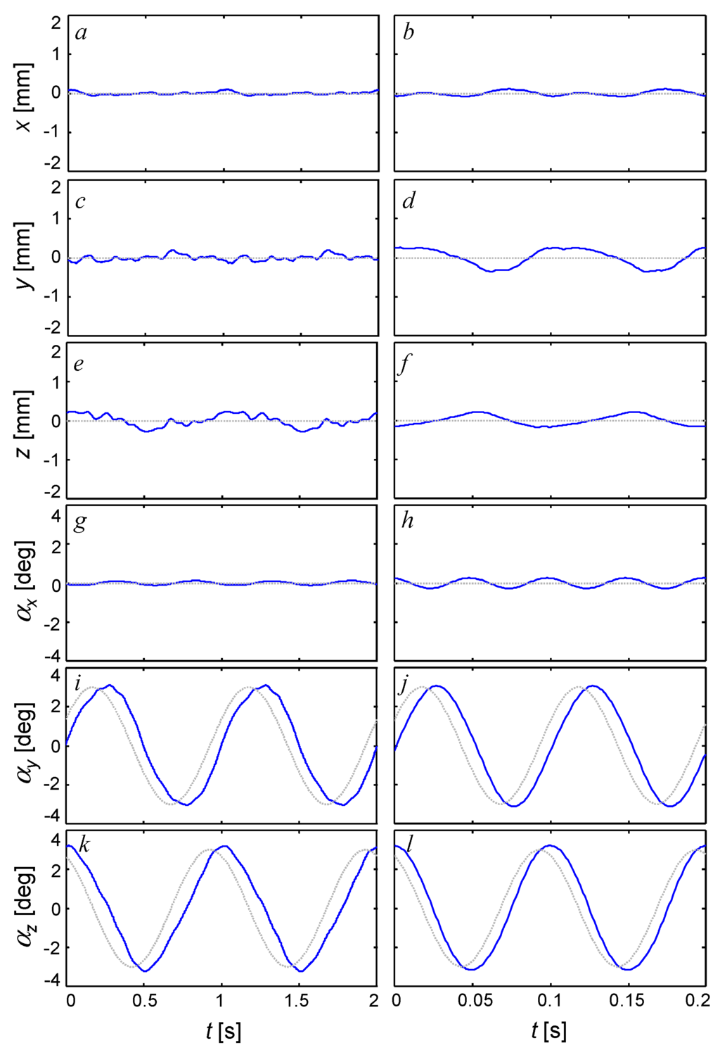 Traverse motion response for 3° amplitude pitch and yaw rotation, 90° out of phase, with measured translation in x (a,b), y (c,d), and z (e,f), and rotations in roll (g,h), pitch (i,j), and yaw (k,l), for frequencies of 1 Hz (a,c,e,g,i,k) and 10 Hz (b,d,f,h,j,l), with a flow ReD = 2.3 × 105. The commanded and measured responses are shown in dotted gray and blue, respectively.