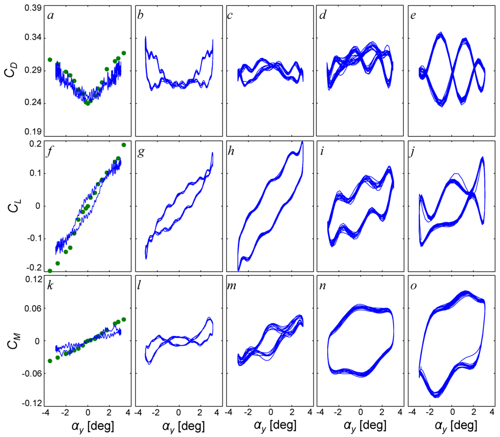 Drag (a–e), Lift (f–j), and Pitch (k–o) coefficients with pitching angle for the axisymmetric model with simple harmonic pitching at an amplitude of αy = ±3° and oscillation frequencies of 1 Hz (a,f,k), 5 Hz (b,g,l), 10 Hz (c,h,m), 15 Hz (d,i,n), and 20 Hz (e,j,o) over a time interval of 1 s, using 100 phase averages, with a flow ReD = 2.3 × 105. The drag, lift, and pitch coefficients measured on the same model geometry at static angles by Lambert et al. [14] are shown in green symbols.